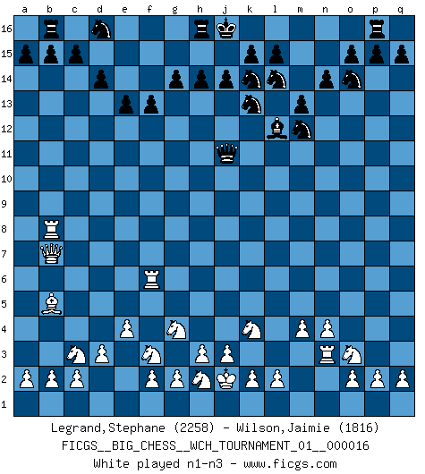 Last move : 1-0 2025 July 14 17:22:6 [Event "FICGS__BIG_CHESS__WCH_TOURNAMENT_01__000016"] [Site "FICGS"] [Date "2024.12.01"] [Round "1"] [White "Legrand,Stephane"] [Black "Wilson,Jaimie"] [Result "1-0"] [WhiteElo "2258"] [BlackElo "1816"] 1.m2-m4 m15-m13 2.p1-o3 j15-k13 3.b1-c3 p16-o14 4.e2-e4 e15-e13 5.f1-b5 b16-c14 6.l1-p5 f16-e15 7.p5-e15 g16-e15 8.j2-k4 d15-d14 9.d2-d3 k16-l14 10.n2-n4 l16-p12 11.h2-g4 n15-n14 12.h1-p8 h16-k14 13.o1-f9 l14-m12 14.m1-m3 p12-n10 15.p8-n8 g15-g14 16.c1-m10 h15-j13 17.q1-m1 c16-g12 18.m3-l3 e15-f13 19.k1-h2 o16-j11 20.l3-l7 m16-m14 21.m1-m3 m14-l14 22.l7-l14 j13-l14 23.m3-l3 n10-l12 24.g1-f3 k14-f10 25.m10-o8 g12-h13 26.n8-b8 f10-b14 27.b8-a7 b14-e11 28.a7-b6 e11-b14 29.b6-q6 b14-e11 30.q6-p7 q16-p16 31.j1-j2 e11-f12 32.e1-n1 j11-k12 33.a1-m1 f13-g11 34.f9-d7 e16-h16 35.l3-l5 k12-o8 36.p7-o8 f15-f13 37.m1-m3 h13-j12 38.d7-j12 g11-j12 39.m3-l3 a16-g16 40.l5-f5 f12-b12 41.l3-l8 g16-b16 42.f5-f6 j12-k14 43.l8-b8 b12-k12 44.o8-n7 k12-j11 45.n7-b7 c14-d16 46.n1-n3 l12-h9 47.b8-b11 j11-k12 48.b7-g7 l14-j15 49.m4-m5 d16-e14 50.b11-b12 k12-k11 51.g7-g9 a15-a14 52.b12-k12 k11-j11 53.g9-j11 k13-j11 54.k12-m12 l15-l13 55.m12-m11 k14-h13 56.o3-n5 j15-l14 57.f6-q6 l14-n13 58.m11-p11 j16-j15 59.h2-k3 h16-m16 60.k3-j5 m16-m14 61.k4-l6 m14-k14 62.n3-k3 k14-k3 63.l2-k3 b16-m16 64.l6-j7 h9-e12 65.k3-k4 m16-m14 66.q6-k6 l13-l12 67.p11-p8 m14-k14 68.k6-k14 h13-k14 69.q2-q4 n13-p14 70.q4-q5 p16-l16 71.j5-h7 l16-l13 72.f3-h4 l13-h13 73.h7-j9 h13-h10 74.o2-o3 j11-g10 75.j9-l8 k14-j12 76.q5-q6 j12-l11 77.q6-q7 o14-n12 78.l8-n9 g10-j9 79.h4-k5 h10-b10 80.b2-b3 b10-b6 81.n5-l6 b6-b9 82.n9-o7 j9-l10 83.p8-p9 1-0 Follow this game move after move (download)I feel as if I were a piece in a game of Chess, when my opponent says of it: That piece cannot be moved. (Soren Kierkegaard) Je mehr ich von der FIDE weiss, um so weniger verstehe ich. (Alexander Kalifman) El Peón aislado arroja penumbra sobre todo el tablero. (Aaron Nimzovich) En blitz, le Cavalier l'emporte sur le Fou. (Vlastimil Hort) For peace of mind, resign as general manager of the universe. (Douglas Adams)