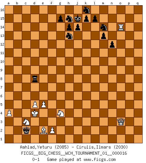 Last move : 0-1 2025 June 1 1:57:26 [Event "FICGS__BIG_CHESS__WCH_TOURNAMENT_01__000016"] [Site "FICGS"] [Date "2024.12.01"] [Round "1"] [White "Aahlad,Yeturu"] [Black "Cirulis,Ilmars"] [Result "0-1"] [WhiteElo "2085"] [BlackElo "2030"] 1.j2-k4 p16-o14 2.e2-e4 j15-k13 3.h1-o7 d15-d13 4.o7-f15 g16-f14 5.m2-m4 h16-o10 6.h2-g4 n15-n13 7.d2-d4 c16-k9 8.f15-n8 o10-k10 9.g1-f3 o16-j11 10.p1-o3 m15-m13 11.l1-p5 k10-l11 12.p5-j11 k13-j11 13.c1-g5 l16-o13 14.b1-c3 o13-l10 15.n8-b8 b15-b14 16.n2-n4 m16-m14 17.f1-c4 l11-n9 18.k1-l3 b16-d15 19.o1-g8 e15-e13 20.o3-n5 f16-c13 21.l3-m5 f14-h13 22.m1-m3 m14-k14 23.q1-m1 c13-m4 24.m3-m4 n9-n5 25.p2-p3 n5-q8 26.q2-q4 q8-l8 27.m1-m2 e16-f16 28.m4-l4 l8-m8 29.k4-l6 m8-q8 30.j3-j4 f16-f10 31.m5-n7 a16-f16 32.l6-m8 k9-h7 33.m8-l10 h7-l4 34.m2-m8 q8-o10 35.g8-l4 f10-l10 36.m8-l8 o10-o2 37.l8-l10 j11-l10 38.b8-l8 o2-l2 39.l8-l10 k14-l14 40.l10-j10 l2-l4 41.j10-d15 l4-h7 42.n7-m5 f16-f3 43.g2-f3 h7-h3 44.m5-l3 l14-l3 45.k2-l3 h3-l3 46.j1-h2 l3-f3 47.c4-e2 f3-p3 48.d15-c15 p3-q4 49.c15-a15 q4-n4 50.a15-b14 n4-j4 51.b14-b16 j16-j15 52.b16-e13 j4-h5 53.h2-g2 h5-g5 54.e13-d13 g5-k5 55.g2-f3 k16-l14 56.f3-e3 q16-b16 57.a1-b1 b16-b8 58.e1-p1 o14-n16 59.b1-k1 k5-m3 60.e3-d2 m3-m10 61.d2-d1 b8-b2 62.d13-d16 n16-m14 63.p1-p15 m10-m3 64.p15-p16 m3-k1 65.d1-d2 k1-k8 66.d2-d3 l14-k16 67.d16-d12 b2-b9 68.a2-a4 b9-c9 69.d12-n3 k8-c8 70.d3-d2 o15-o14 71.p16-p15 m14-k13 72.p15-q15 c8-k8 73.d2-d3 k8-c15 74.d3-d2 c15-j9 75.e4-e5 c9-d9 76.d4-d5 d9-d8 77.n3-o3 n13-n12 78.q15-o15 j9-k8 79.d2-d3 k8-k9 80.d3-d2 k9-l9 81.d2-d3 k13-m14 82.o15-o14 l9-k9 83.d3-d4 k9-c2 0-1 Follow this game move after move (download)The passed pawn is a criminal, who should be kept under lock and key. Mild measures, such as police surveillance, are not sufficient. (Nimzovitch) Ich habe kein Problem mit Frauen, sondern nur mit dem Niveau ihres Schachspiels (Judith Polgar) Si el ingenio solamente fuese necesario para lucirse, las mujeres serían las mejores jugadoras de Ajedrez del mundo. (Albin) Shah mat. Le roi est mort. Cri de fierté d'un joueur venant de terrasser son adversaire, courtoisement, sans effusion de sang. Are you threatening me, Master Jedi ? (Chancellor Palpatine in Star Wars ep.3)
