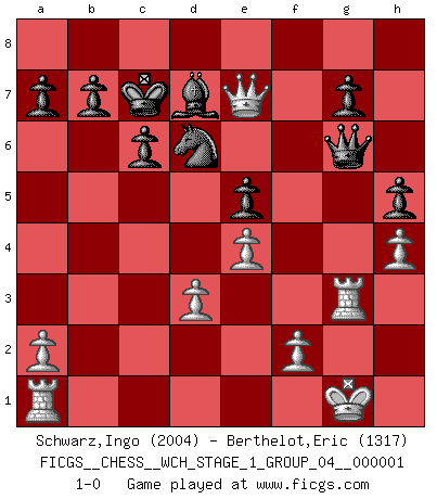 Last move : 1-0 2006 September 13 12:48:10 [Event "FICGS__CHESS__WCH_STAGE_1_GROUP_04__000001"] [Site "FICGS"] [Date "2006.07.01"] [Round "1"] [White "Schwarz,Ingo"] [Black "Berthelot,Eric"] [Result "1-0"] [WhiteElo "2004"] [BlackElo "1317"] 1.e4 e5 2.Bc4 Nf6 3.d3 c6 4.Nf3 d6 5.O-O Bg4 6.h3 Bh5 7.g4 Bg6 8.Nc3 Be7 9.Nh2 h5 10.g5 Nfd7 11.h4 f6 12.Nf3 fxg5 13.Nxg5 Bxg5 14.Bxg5 Qb6 15.Ne2 Nf6 16.Ng3 Nbd7 17.Qf3 O-O-O 18.Bb3 Rdf8 19.Nf5 Ng4 20.Be7 d5 21.Bxf8 Rxf8 22.c4 dxc4 23.Bxc4 Qxb2 24.Rfb1 Qd2 25.Be6 Bxf5 26.Bxd7+ Bxd7 27.Qxf8+ Kc7 28.Rd1 Qh6 29.Qf7 Nf6 30.Re1 Ne8 31.Re3 Nd6 32.Qe7 Qg6+ 33.Rg3 1-0 Bishop's Opening : Berlin defense Kingside Castling by player White (move 5) Queenside Castling by player Black (move 17) Player White won this chess game. Follow this game move after move (download)It is the aim of the modern school, not to treat every position according to one general law, but according to the principle inherent in the position. (Richard Reti) Korrekt heißt in Deutschland die Haltung eines Mannes, dessen Benehmen nach dem Urteile seiner Nachbarn seiner Stellung angemessen ist. Um korrekt zu sein, muß man sich der Meinung der anderen anpassen... (Emanuel Lasker) Con o sin el título, Bobby Fischer fue sin lugar a dudas el mas grande jugador de su época. (Burt Hochberg) Le moment que je préfère le plus dans une rencontre, c'est celui où je sens que la personnalité de l'adversaire se brise. (Robert Fischer) Who needs drugs and alcohol if he can play Big Chess at FICGS ? (Heinz-Georg Lehnhoff)