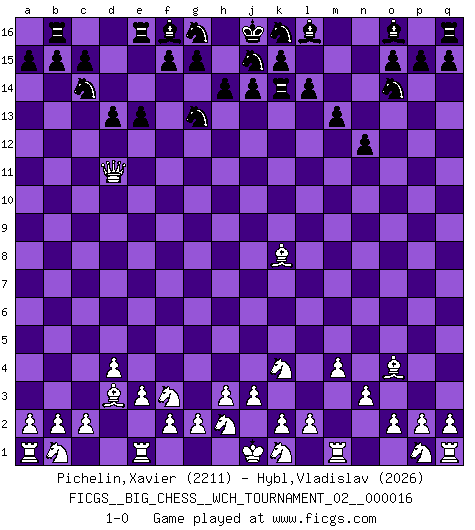 Last move : 1-0 2025 January 27 23:19:40 [Event "FICGS__BIG_CHESS__WCH_TOURNAMENT_02__000016"] [Site "FICGS"] [Date "2024.12.01"] [Round "1"] [White "Pichelin,Xavier"] [Black "Hybl,Vladislav"] [Result "1-0"] [WhiteElo "2211"] [BlackElo "2026"] 1.j2-k4 p16-o14 2.h1-o7 h15-g13 3.d2-d4 n15-n13 4.g1-f3 b16-c14 5.m2-m4 e15-e13 6.l1-o4 d15-d13 7.c1-k8 m15-m13 8.n2-n3 c16-k9 9.o7-b7 a16-b16 10.b7-b9 h16-h15 11.b9-k9 h15-c10 12.e2-e3 m16-m14 13.f1-d3 m14-k14 14.k9-m11 n13-n12 15.m11-p11 l15-l14 16.o1-d11 c10-d11 17.p11-d11 1-0 Follow this game move after move (download)I'd rather have a Pawn than a finger. (Reuben Fine) Man kann eine Schachpartie nur gewinnen, wenn das Gleichgewicht gestört ist. In einer Stellung mit ungestörtem Gleichgewicht ist auch das größte Genie hilflos - in der Stellung steckt dann eben kein genialer Einfall. (Wilhelm Steinitz) Nunca antes ha habido un jugador de Ajedrez con tal conocimiento a fondo de las complejidades del juego y una inmensa voluntad absolutamente indomable de ganar. Yo pienso que Fischer es el jugador mas grande que jamás haya existido. (Lisa Lane) J'apprécie les joueurs d'est-indienne, c'est grâce à eux que je nourris ma famille depuis tant d'années. (Petrosian) A belief is an idea the mind possesses, an idea that possesses the mind. (Robert Oxden Bolton)