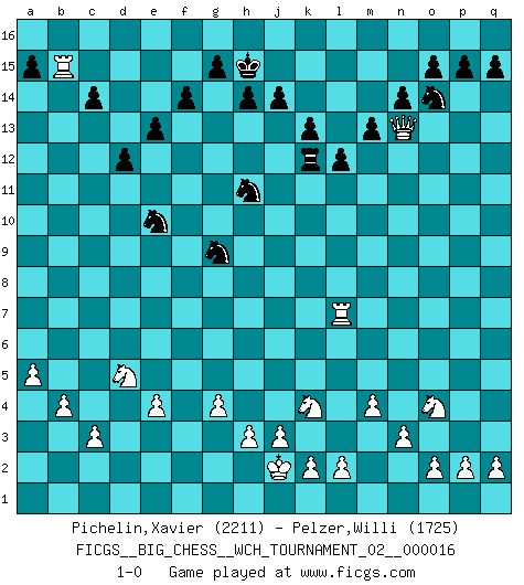 Last move : 1-0 2025 April 4 7:0:29 [Event "FICGS__BIG_CHESS__WCH_TOURNAMENT_02__000016"] [Site "FICGS"] [Date "2024.12.01"] [Round "1"] [White "Pichelin,Xavier"] [Black "Pelzer,Willi"] [Result "1-0"] [WhiteElo "2211"] [BlackElo "1725"] 1.j2-k4 j15-l14 2.h1-o7 h15-g13 3.h2-g4 p16-o14 4.m2-m4 h16-k14 5.e2-e4 e15-e13 6.f1-c4 f16-b12 7.g1-j2 m15-m13 8.d2-d3 d15-d13 9.o7-m9 c16-f13 10.k1-h2 l16-p12 11.m9-m6 n15-n14 12.l1-o4 b12-d14 13.c1-k8 o16-l13 14.n2-n3 b16-d15 15.b1-d2 f15-f14 16.e1-e3 l13-p9 17.m6-p6 g16-j15 18.o1-g8 f13-g14 19.p6-p7 p9-m12 20.k8-j9 d15-f16 21.c2-c3 f16-h15 22.e3-f3 m12-j9 23.o4-j9 q16-p16 24.c4-e6 h15-j13 25.d2-c4 p12-m9 26.p1-n2 m9-k11 27.n2-o4 k11-g8 28.e6-g8 g14-k11 29.g8-j6 e16-e14 30.m1-m3 d14-c13 31.m3-l3 c13-g9 32.j9-e5 g9-k12 33.p7-p5 e14-c14 34.q1-m1 k11-c4 35.d3-c4 c14-c4 36.b2-b3 c4-c13 37.m1-m3 k12-m14 38.l3-k3 c13-c11 39.m3-l3 m14-n13 40.l3-l5 n13-e5 41.l5-e5 k16-m15 42.j6-k5 j16-h15 43.k4-m5 m16-d16 44.k5-d11 c11-d11 45.k3-k14 m15-k14 46.j2-k4 d16-d14 47.e5-c5 d14-a14 48.c5-c15 a16-b16 49.p5-o5 d11-d2 50.a2-a4 p16-d16 51.g4-f6 a14-c14 52.c15-c14 b15-c14 53.b3-b4 b16-b9 54.o5-f13 j13-g14 55.f13-b9 d13-d12 56.f6-d5 d16-d13 57.b9-b6 d13-b13 58.b6-e3 d2-b2 59.f3-f4 k14-h13 60.h2-f3 h13-f12 61.f3-d4 g13-h11 62.e3-c1 b2-f2 63.f4-f2 l14-j13 64.j1-j2 l15-l13 65.c1-g5 k15-k13 66.f2-f7 f12-e10 67.a1-f1 h11-g9 68.f7-l7 l13-l12 69.f1-f6 j13-h11 70.f6-b6 b13-a13 71.a4-a5 a13-a8 72.d4-e6 h11-j9 73.m5-k6 j15-h13 74.g2-g4 g14-f12 75.g5-k5 h13-g11 76.k5-j4 a8-k8 77.j4-j9 k8-k6 78.e6-f8 k6-k12 79.f8-e10 g11-e10 80.b6-b15 f12-h11 81.j9-n13 1-0 Follow this game move after move (download)Everything is in a state of flux, and this includes the world of Chess. (Mikhail Botvinnik) Ich verstehe mehr vom Schach als irgendein anderer lebender Meister. (José Raúl Capablanca) ¿Esta Bobby Fischer algo cuerdo?. (Salo Flohr) Vous n'êtes pas toujours obligé de jouer le meilleur coup. Un coup doit être actif, entreprenant, correct et beau ! (David Bronstein) Strategy without tactics is the slowest route to victory. Tactics without strategy is the noise before defeat. (Sun Tzu)