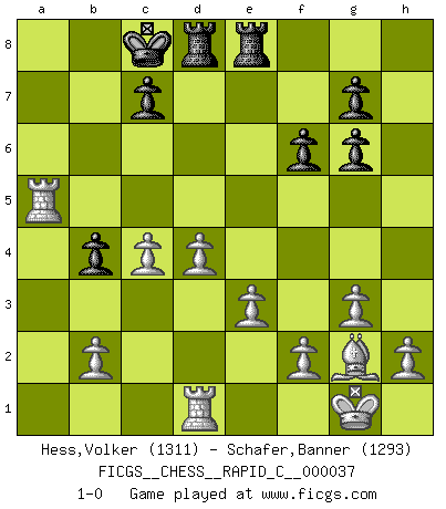 Last move : 1-0 2007 October 20 5:29:39 [Event "FICGS__CHESS__RAPID_C__000037"] [Site "FICGS"] [Date "2007.09.22"] [Round "1"] [White "Hess,Volker"] [Black "Schafer,Banner"] [Result "1-0"] [WhiteElo "1311"] [BlackElo "1293"] 1.c4 Nc6 2.Nc3 e5 3.g3 Bc5 4.Bg2 Nf6 5.d3 Ng4 6.e3 Qf6 7.Qxg4 d5 8.Qf3 Qxf3 9.Nxf3 Bg4 10.Nxd5 Bb4+ 11.Nxb4 Nxb4 12.O-O O-O-O 13.Nxe5 Bh5 14.d4 f6 15.Nf3 Bg6 16.Bd2 Nd3 17.Bc3 b6 18.Nh4 Rhe8 19.Nxg6 hxg6 20.a4 a5 21.Rfd1 Nb4 22.Bxb4 axb4 23.a5 bxa5 24.Rxa5 1-0 English Opening Kingside Castling by player White (move 12) Queenside Castling by player Black (move 12) Player White won this chess game. Follow this game move after move (download)By the beauty of his games, the clarity of his play, and the brilliance of his ideas, Fischer made himself an artist of the same stature as Brahms, Rembrandt, and Shakespeare. (David Levy) Ohne Leiden bildet sich kein Charakter. (Ernst Freiherr von Feuchtersleben) A la fecha, Fischer esta simplemente un nivel arriba de todos los mejores jugadores de Ajedrez del mundo. (John Jacobs) Toute estimation doit être constamment réévaluée. (Jacob Estrin) Animated gif is worth one mega-word. (Unknown)