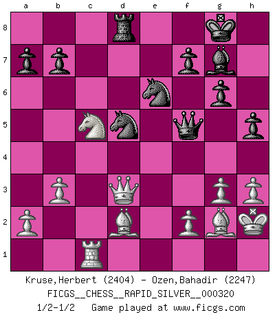 Last move : 1/2-1/2 2025 February 9 8:17:22 [Event "FICGS__CHESS__RAPID_SILVER__000320"] [Site "FICGS"] [Date "2024.12.16"] [Round "1"] [White "Kruse,Herbert"] [Black "Ozen,Bahadir"] [Result "1/2-1/2"] [WhiteElo "2404"] [BlackElo "2247"] 1.Nf3 d5 2.g3 g6 3.Bg2 Bg7 4.d4 Nf6 5.O-O O-O 6.c4 c6 7.Qa4 Nfd7 8.cxd5 cxd5 9.Nc3 Nb6 10.Qd1 Nc6 11.h3 Be6 12.e3 Rc8 13.Qd2 Qc7 14.Qd1 h5 15.Qe2 Qd7 16.Kh2 Rfd8 17.Bd2 Bf5 18.Nh4 e5 19.dxe5 Bxe5 20.Rac1 Bg7 21.Nxf5 Qxf5 22.b3 d4 23.Ne4 Nd5 24.exd4 Nxd4 25.Qd3 Rxc1 26.Rxc1 Ne6 27.Nc5 1/2-1/2 Follow this game move after move (download)By this measure (on the gap between Fischer & his contemporaries), I consider him the greatest world champion. (Garry Kasparov) Stelle das Brett so, daß die Sonne in die Augen deines Gegners scheint. (Ruy López) La batalla por la última verdad nunca sera ganada. Y es por eso que el Ajedrez es tan fascinante. (Hans Kmoch) En blitz, le Cavalier l'emporte sur le Fou. (Vlastimil Hort) To steal ideas from one person is plagiarism. To steal from many is research. (Unknown)