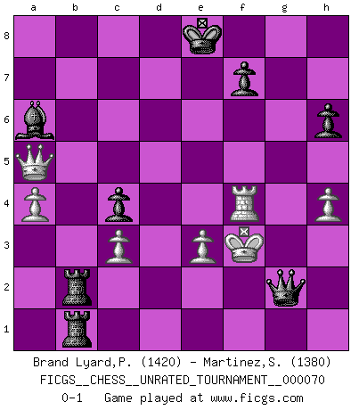 Last move : 0-1 2025 February 8 20:49:21 [Event "FICGS__CHESS__UNRATED_TOURNAMENT__000070"] [Site "FICGS"] [Date "2024.12.23"] [Round "1"] [White "Brand Lyard,Paul"] [Black "Martinez,Silvio"] [Result "0-1"] [WhiteElo "1420"] [BlackElo "1380"] 1.d4 d5 2.Bf4 Nf6 3.e3 Nc6 4.Bb5 a6 5.Bxc6+ bxc6 6.Ne2 e6 7.O-O Bd6 8.Bg5 h6 9.Bxf6 gxf6 10.Nbc3 Rg8 11.g3 f5 12.f4 a5 13.a4 c5 14.Nb5 Ba6 15.Nxd6+ Qxd6 16.Rf2 c4 17.c3 c5 18.h4 Rb8 19.Rb1 cxd4 20.Nxd4 e5 21.Nxf5 Qf6 22.g4 exf4 23.Qxd5 Rxg4+ 24.Kf1 Qg6 25.Qxa5 Rg1+ 26.Ke2 Rxb1 27.Nd6+ Qxd6 28.Rxf4 Qd1+ 29.Kf2 R8xb2+ 30.Kg3 Qg1+ 31.Kf3 Qg2+ 0-1 Follow this game move after move (download)I have added these principles to the law: get the Knights into action before both Bishops are developed. (Emanuel Lasker) Man braucht nicht immer den besten Zug zu spielen: Ein Zug muß aktiv, unternehmungslustig, korrekt und schön sein. (David Bronstein) ¿Esta Bobby Fischer algo cuerdo?. (Salo Flohr) Aux échecs, l'amour-propre est satisfait quand on remporte la victoire, mais il n'y a pas de honte à être battu. (Benjamin Franklin) Wikichess, chess moves explained by 'experimented' players. (Thibault de Vassal)