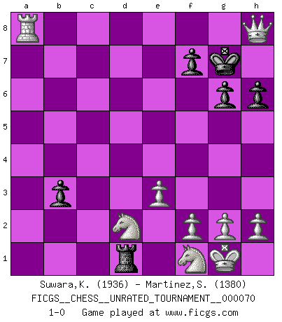 Last move : 1-0 2025 May 31 20:48:23 [Event "FICGS__CHESS__UNRATED_TOURNAMENT__000070"] [Site "FICGS"] [Date "2024.12.23"] [Round "1"] [White "Suwara,Kazimierz"] [Black "Martinez,Silvio"] [Result "1-0"] [WhiteElo "1936"] [BlackElo "1380"] 1.d4 d5 2.Nf3 Nf6 3.Bg5 h6 4.Bh4 Nc6 5.Bxf6 exf6 6.e3 f5 7.Bb5 Bb4+ 8.c3 Ba5 9.Qd3 Bd7 10.O-O O-O 11.a4 a6 12.Bxc6 Bxc6 13.Qxf5 Bd7 14.Qxd5 b6 15.b4 Bxa4 16.Qxd8 Rfxd8 17.Rxa4 Bxb4 18.cxb4 b5 19.Ra2 c6 20.Rc1 g6 21.Rxc6 Kg7 22.R2xa6 Rdc8 23.Rxa8 Rxc6 24.Nbd2 Rc1+ 25.Nf1 Rb1 26.d5 Rxb4 27.d6 Rb1 28.d7 Rd1 29.N3d2 b4 30.d8Q b3 31.Qh8+ 1-0 Follow this game move after move (download)Fischer is the strongest player in the world. In fact, the strongest player who ever lived. (Larry Evans) Sie führen leise Selbstgespräche, schlürfen lautstark ihre Getränke, schmatzen hörbar beim Essen, blasen ihrem Gegenüber Rauch in die Augen, niesen ihm ins Gesicht, starren ihn unverwandt an, bis er sich unter ihren Blicken windet, rutschen ständig auf ihrem Stuhl hin und her, rülpsen und bohren in der Nase. (Anonymous) La belleza de un movimiento no se refleja solo en su apariencia, sino en el pensamiento detrás de él. (Siegbert Tarrasch) Les Echecs sont affaire de jugement sensible. Savoir quand frapper et quand esquiver. (Fischer) My poor ole parrot... Is not in the circulation of displays ....poo hoo hoo :) (Wayne Lowrance's enigma)