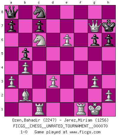 Last move : 1-0 2025 February 17 21:23:27 [Event "FICGS__CHESS__UNRATED_TOURNAMENT__000070"] [Site "FICGS"] [Date "2024.12.23"] [Round "1"] [White "Ozen,Bahadir"] [Black "Jerez,Miriam"] [Result "1-0"] [WhiteElo "2247"] [BlackElo "1256"] 1.g3 e5 2.Bg2 Nc6 3.a3 d5 4.d3 Nf6 5.b4 Bd6 6.Nd2 O-O 7.c4 dxc4 8.Nxc4 b5 9.Bxc6 Rb8 10.Na5 Bd7 11.Nf3 Bxc6 12.Nxc6 Qd7 13.Nxb8 Qe6 14.Na6 Nd5 15.O-O Nc3 16.Qc2 Nd5 17.Nc5 Qf6 18.Nd7 Qe7 19.Nxf8 Qxf8 20.e4 Nb6 21.Bb2 Qd8 22.Nxe5 h6 23.f4 f6 24.Nc6 Qa8 25.e5 fxe5 26.fxe5 Bf8 27.Qb3+ Kh7 28.Rac1 g6 29.Qf7+ Bg7 30.e6 Nc8 31.Qxg7+ 1-0 Follow this game move after move (download)The blunders are all there on the board, waiting to be made. (Savielly Tartakover) Charakterschwächen offenbaren sich normalerweise während einer Schachpartie. (Garry Kasparov) Me siento como si fuera una pieza en una partida de Ajedrez, cuando mi oponente me indica: esa pieza no puede ser movida. (Soren Kierkegaard) Donnez-moi un Cavalier en 6e et je gagnerais toutes mes parties. (Steinitz) Waiting for chance ? Play in casinos. (FICGS proverb)