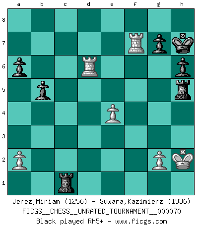 Last move : 0-1 2025 July 3 0:43:42 [Event "FICGS__CHESS__UNRATED_TOURNAMENT__000070"] [Site "FICGS"] [Date "2024.12.23"] [Round "1"] [White "Jerez,Miriam"] [Black "Suwara,Kazimierz"] [Result "0-1"] [WhiteElo "1256"] [BlackElo "1936"] 1.e4 c5 2.d4 cxd4 3.Ne2 e5 4.Nd2 Nc6 5.Nf3 Nf6 6.Bg5 Bb4+ 7.c3 dxc3 8.Nxc3 Bxc3+ 9.bxc3 d6 10.Bb5 h6 11.Bxf6 Qxf6 12.O-O a6 13.Ba4 O-O 14.h3 b5 15.Bb3 Qg6 16.Bd5 Bxh3 17.Nh4 Qg5 18.Qf3 Bg4 19.Qg3 Rac8 20.f3 Qe3+ 21.Qf2 Qxf2+ 22.Rxf2 Bd7 23.Ng6 Rfe8 24.f4 exf4 25.Rxf4 Ne5 26.Nxe5 Rxe5 27.Bxf7+ Kh7 28.Raf1 Rxc3 29.Rd1 Be6 30.Rxd6 Rc1+ 31.Kh2 Bxf7 32.Rxf7 Rh5+ 33.Kg3 a5 34.Kg4 Rg5+ 35.Kh3 Rh1+ 0-1 Follow this game move after move (download)Nowadays, when you're not a grandmaster at 14, you can forget about it. (Anand Viswanathan) Ich erzeugte keinen Neid, da mich die Schachspieler als Musiker und die Musiker als Schachspieler betrachteten. (Mark Taimanov) Yo tuve un dolor de muelas en la primer partida. En el segundo juego, tuve un dolor de cabeza. En el tercero, tuve un ataque de reumatísmo. En la cuarta partida, no me sentía muy bien. ¿Y en el quinto juego? Bueno, ¿que acaso uno tiene que ganar todos los juegos?. (Siegbert Tarrasch) Les Cavaliers se révèlent fort utiles dans les positions fermées. D'habitude, les Fous sont un peu plus forts que les Cavaliers dans les positions ouvertes. Qu'on le veuille ou non, il restera toujours des exceptions ! Heh, heh, heh. Time to abandon ship. (General Grievous in Star Wars ep.3)
