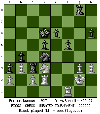 Last move : 0-1 2025 June 30 14:34:38 [Event "FICGS__CHESS__UNRATED_TOURNAMENT__000070"] [Site "FICGS"] [Date "2024.12.23"] [Round "1"] [White "Foster,Duncan"] [Black "Ozen,Bahadir"] [Result "0-1"] [WhiteElo "1927"] [BlackElo "2247"] 1.e4 c6 2.d4 d5 3.e5 Bf5 4.Nf3 e6 5.Bd3 Bxd3 6.Qxd3 c5 7.O-O cxd4 8.Qxd4 Nc6 9.Qa4 Nge7 10.Rd1 Qa5 11.Qxa5 Nxa5 12.Bd2 Nc4 13.Bc3 Rc8 14.Nbd2 h6 15.Rac1 g5 16.h3 Bg7 17.Re1 Kd7 18.Rcd1 Nb6 19.Ne4 Na4 20.Rd4 b5 21.Rd2 Nxc3 22.Nxc3 b4 23.Nb5 a6 24.Nbd4 Bf8 25.Ne2 Rc7 26.Ng3 Nc6 27.Nh5 Be7 28.g3 Na5 29.b3 Rc3 30.Nh2 Nc6 31.Kg2 a5 32.Ng4 Bc5 33.Nhf6+ Kc8 34.Nh5 Bd4 35.R1e2 a4 36.Rd1 a3 37.Red2 Bxe5 38.Nxe5 Nxe5 39.Re2 Nc6 40.f4 gxf4 41.Nxf4 Kc7 42.Rf2 Kd6 43.Nd3 f5 44.Rfd2 Rg8 45.Rf1 Nd4 46.Rc1 e5 47.g4 fxg4 48.Nxb4 gxh3+ 49.Kh2 Nf3+ 0-1 Follow this game move after move (download)I play correspondence chess because it is both art and science while chess is art only. (A player at FICGS) Ich spiele 70 Eröffnungssysteme. (Viktor Kortschnoi) El Ajedrez demanda una total concentración. (Bobby Fischer) Si rien de grave n'est détecté lors de l'analyse d'une position, on joue alors le coup. Seconde règle de Blumenfeld. Whenever people agree with me, I always feel I must be wrong. (Oscar Wilde)