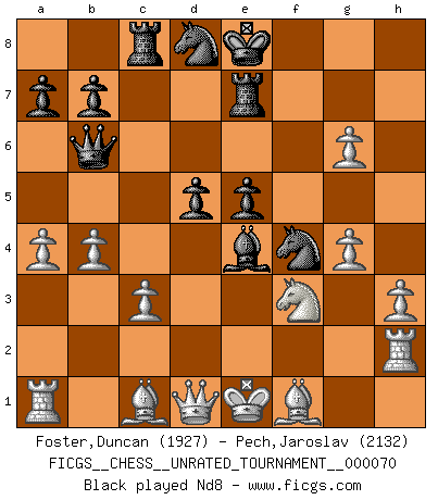 Last move : 0-1 2025 September 12 15:52:24 [Event "FICGS__CHESS__UNRATED_TOURNAMENT__000070"] [Site "FICGS"] [Date "2024.12.23"] [Round "1"] [White "Foster,Duncan"] [Black "Pech,Jaroslav"] [Result "0-1"] [WhiteElo "1927"] [BlackElo "2132"] 1.e4 e6 2.d4 d5 3.Nc3 Nf6 4.e5 Nfd7 5.f4 c5 6.Nf3 Nc6 7.Ne2 Qb6 8.c3 f6 9.g3 cxd4 10.Nexd4 fxe5 11.Nxe6 Nc5 12.Nxf8 Bg4 13.h3 Bf5 14.g4 Be4 15.Nxh7 Rxh7 16.b4 Ne6 17.f5 Nf4 18.Rh2 Rc8 19.a3 g6 20.fxg6 Re7 21.a4 Nd8 22.g7 Rxg7 23.Nxe5 Nfe6 24.Qe2 Qd6 25.Bh6 Rh7 26.g5 Qxe5 27.Rc1 Rxc3 0-1 Follow this game move after move (download)I have never in my life played the French Defence, which is the dullest of all openings. (Wilhelm Steinitz) Das typische an einem Großmeister ist, daß er eine gewonnene Position schnell und schmerzlos gewinnt. (Irving Chernev) Durante una competencia de Ajedrez, un Maestro de Ajedrez deberá ser una combinación de presa de caza y un Monge. (Alexander Alekhine) Nous sommes les pions de la mystérieuse partie d'Echecs jouée par Dieu. Il nous déplace, nous arrête, nous pousse encore, puis nous lance un à un dans la boîte du Néant. Epitaphe sur la tombe de David Janowsky (1868-1927). Computers make it easier to do a lot of things, but most of the things they make it easier to do don't need to be done. (Andy Rooney)