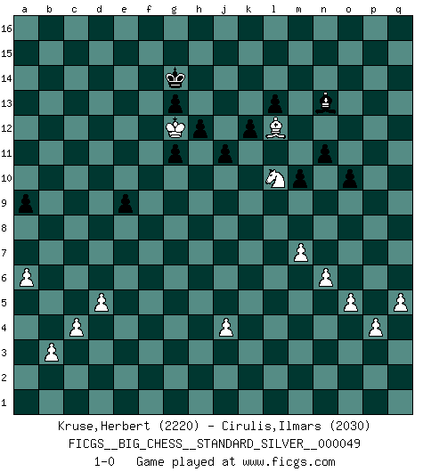Last move : 1-0 2025 January 12 0:5:30 [Event "FICGS__BIG_CHESS__STANDARD_SILVER__000049"] [Site "FICGS"] [Date "2024.12.23"] [Round "1"] [White "Kruse,Herbert"] [Black "Cirulis,Ilmars"] [Result "1-0"] [WhiteElo "2220"] [BlackElo "2030"] 1.j2-k4 h15-g13 2.h1-o7 n15-n14 3.m2-m4 b16-c14 4.l1-p5 k16-h15 5.d2-d4 j15-k13 6.c1-l9 d15-d13 7.n2-n3 h16-m12 8.l9-k10 m12-j12 9.o7-o9 p16-o14 10.b1-c3 g16-j15 11.e2-e4 c16-j10 12.f1-b5 g13-h11 13.o9-b9 a16-b16 14.o1-f9 j12-g12 15.e1-e3 h11-k10 16.p5-k10 o16-j11 17.e3-g3 g12-e12 18.b9-e12 d13-e12 19.k10-j9 e15-e13 20.p1-o3 b16-d16 21.d4-d5 d16-d8 22.j9-g11 d8-f8 23.g11-b6 e16-e14 24.f2-f3 e14-g14 25.g3-g14 f15-g14 26.f9-g10 e12-e11 27.h2-g4 f16-e15 28.k1-h2 e15-h12 29.b6-a7 e11-e10 30.o3-n5 m15-m13 31.a7-d10 e10-e9 32.g4-e5 l16-m15 33.d10-c11 f8-c8 34.c11-b10 j11-h10 35.m1-m3 k13-j11 36.g10-m15 o14-m15 37.m3-l3 c8-g8 38.j1-h1 h10-j9 39.h2-g4 g8-p8 40.p2-p3 p8-o8 41.o2-o4 q15-q13 42.b10-g5 q13-q12 43.a1-d1 q16-q13 44.d1-d4 m13-m12 45.d4-a4 j10-h9 46.q1-p1 q13-g13 47.g5-c9 g13-l13 48.l3-l13 m15-l13 49.a4-a6 l13-k11 50.g1-e2 m16-m13 51.c9-h4 q12-q11 52.a6-q6 m13-q13 53.a2-a4 q11-q10 54.p1-m1 q10-q9 55.m1-m3 q13-q10 56.h4-k6 o8-o9 57.k6-l5 q10-k10 58.e2-f4 h15-j13 59.f4-g6 p15-p13 60.m3-l3 l15-l14 61.g6-j7 h9-j10 62.l5-n7 k10-n10 63.n7-l5 j11-h9 64.j7-l6 j15-h13 65.h1-h2 c14-d12 66.b2-b3 c15-c13 67.c3-e2 b15-b13 68.e2-f4 a15-a13 69.f4-g6 c13-c12 70.q6-q7 a13-a12 71.k4-j6 o15-o13 72.l3-k3 j10-o5 73.q7-p7 o5-l2 74.k3-l3 l2-m1 75.p7-p13 n10-k10 76.k2-k4 h9-f8 77.j3-j4 m1-q5 78.n5-p6 q5-p6 79.p13-p6 d12-e10 80.g6-f8 e10-f8 81.l6-n7 o9-l9 82.k4-k5 k10-k7 83.n7-l6 h12-k10 84.e5-d3 k7-q7 85.q2-q4 k11-h10 86.h2-j2 h13-j11 87.j2-k3 q7-c7 88.c2-c4 j11-h9 89.l5-h2 c7-c11 90.h2-f4 l9-k9 91.f4-a9 c11-e11 92.p6-p16 j16-h15 93.p16-b16 e11-b11 94.a9-e13 j13-g12 95.e13-a9 h9-g7 96.l6-k4 g7-j6 97.k4-j6 b11-b9 98.a9-g3 a12-a11 99.g3-h4 b9-b11 100.j6-l5 f8-g6 101.h4-g3 g6-h8 102.b16-n16 b11-n11 103.g3-f4 k10-l9 104.f4-l9 k9-l9 105.n3-n4 l9-k9 106.d3-f4 h10-g8 107.f4-h5 j9-h10 108.n4-n5 g12-f10 109.m4-m5 h10-f8 110.l3-l2 f8-g9 111.m5-m6 f10-h9 112.h5-k4 h9-k8 113.n16-b16 n11-b11 114.l5-n4 n14-n13 115.b16-n16 n13-n12 116.n16-n13 k9-o9 117.l2-l8 g9-h10 118.k4-l6 h8-j10 119.l6-k8 j10-k8 120.g4-j5 g8-j7 121.l8-l2 g14-g13 122.j5-l6 k8-l6 123.k5-l6 b11-g11 124.k3-j3 h10-m14 125.n13-n14 m14-e7 126.j3-h2 e7-d6 127.h2-g1 g11-k11 128.g1-f2 k11-k4 129.n4-o6 d6-c5 130.f2-e2 k4-k3 131.n14-p14 o9-k9 132.p14-p7 c5-g9 133.p7-k7 k3-k7 134.l6-k7 k9-k7 135.f3-f4 j7-g6 136.f4-f5 g6-h8 137.e2-f3 k7-k9 138.b5-h11 k9-h9 139.h11-f13 g15-g14 140.f13-d15 h8-j6 141.d15-b13 j6-g5 142.f3-e3 c12-c11 143.l2-l7 g5-h3 144.b13-c14 h9-h8 145.g2-h3 h8-h3 146.e3-e2 h3-h4 147.c14-a12 h4-e4 148.e2-d3 e4-f4 149.l7-l9 g9-f8 150.a12-h5 f4-f5 151.l9-q9 f5-g5 152.p3-p4 g5-g3 153.d3-c2 g3-g9 154.q9-g9 f8-g9 155.c2-d3 o13-o12 156.d3-e4 k15-k13 157.e4-f5 n12-n11 158.f5-e6 m12-m11 159.e6-d7 g9-f8 160.d7-c8 j14-j13 161.c8-d9 h14-h13 162.d9-c10 g13-g12 163.c10-c11 j13-j12 164.a4-a5 j12-j11 165.a5-a6 g14-g13 166.c11-d11 g12-g11 167.d11-e12 h15-h14 168.e12-f11 h13-h12 169.f11-g12 k13-k12 170.h5-f7 m11-m10 171.m6-m7 o12-o11 172.q4-q5 o11-o10 173.f7-l12 l14-l13 174.n5-n6 a11-a10 175.o4-o5 a10-a9 176.o6-n8 h14-g14 177.n8-l7 f8-g7 178.l7-m9 g7-m12 179.m9-k8 m12-n13 180.k8-l10 1-0 Follow this game move after move (download)For me, Chess is life and every game is like a new life. Every Chess player gets to live many lives in one lifetime. (Eduard Gufeld) Du kannst im Schach nur gut werden, wenn du das Spiel liebst. (Robert James Fischer) El juego del Ajedrez no es solamente una diversión quieta; algunas cualidades muy valuables de la mente se pueden adquirir y cultivar con el, como convertirlos en habitos disponibles para toda ocasión; ya que la vida es algo así como el Ajedrez. (Benjamin Franklin) Le plus grand jeu de l'esprit jamais inventé, plus vous l'apprenez, plus vous y prenez du plaisir. (Garry Kasparov) The real voyage of discovery consists not in seeking new lands but in seeing with new eyes. (Marcel Proust)