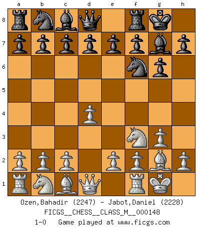 Last move : 1-0 2025 February 18 12:22:54 [Event "FICGS__CHESS__CLASS_M__000148"] [Site "FICGS"] [Date "2024.12.24"] [Round "1"] [White "Ozen,Bahadir"] [Black "Jabot,Daniel"] [Result "1-0"] [WhiteElo "2247"] [BlackElo "2228"] 1.d4 Nf6 2.Nf3 g6 3.g3 Bg7 4.Bg2 O-O 5.O-O 1-0 This chess game has been lost on time (started : 2024.12.24 6:41:52) Follow this game move after move (download)A Chess game is divided into three stages: the first, when you hope you have the advantage, the second when you believe you have an advantage, and the third... when you know you're going to lose ! (Savielly Tartakower) Mit Schach schule ich mein Gefühl für Geometrie, was für Tennis und Schach gleichermaßen wichtig ist. (Boris Becker) Cuando tu no sabes absolutamente que mas hacer, es tiempo de entrar en pánico. (John van der Wiel) Tous ces prétendus hommes politiques sont les pions, les Cavaliers, les Tours ou les Fous d'une partie d'échecs qui se jouera tant qu'un hasard ne renversera pas l'échiquier. (Honoré de Balzac) Luck is the residue of design. (John Milton)