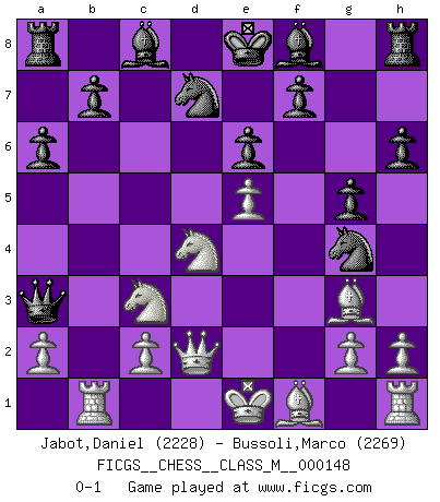 Last move : 0-1 2025 March 19 19:57:15 [Event "FICGS__CHESS__CLASS_M__000148"] [Site "FICGS"] [Date "2024.12.24"] [Round "1"] [White "Jabot,Daniel"] [Black "Bussoli,Marco"] [Result "0-1"] [WhiteElo "2228"] [BlackElo "2269"] 1.e4 c5 2.Nf3 d6 3.d4 cxd4 4.Nxd4 Nf6 5.Nc3 a6 6.Bg5 e6 7.f4 Qb6 8.Qd2 Qxb2 9.Rb1 Qa3 10.e5 dxe5 11.fxe5 h6 12.Bh4 g5 13.Bf2 Ng4 14.Bg3 Nd7 0-1 This chess game has been lost on time (started : 2024.12.24 6:41:52) Follow this game move after move (download)An attack on the wing should be met by play in the center. (Nimzovitch) Ich bewundere Kasparows phantasievolle Angriffssiege aus den Achtzigern und Neunzigern, aber wenn man sie mit dem Computer überprüft, nimmt der Computer in jeder zweiten Partie die Opfer an, verteidigt sich und gewinnt. (Vladimir Kramnik) Los problemas de Ajedrez exigen del compositor las mismas virtudes que caracterizan todo el arte de valor: originalidad, invención, concisión, armonía, complejidad e insinceridad explendida. (Vladimir Nabokov) Les Echecs sont et restent toujours un combat, un combat intégral comme la boxe, la lutte ou un autre sport, et où il doit y avoir un vainqueur et un vaincu. (Joseph Emil Diemer) History is the quarrels of popes and kings, with wars or pestilences in every page; the men all so good for nothing, and hardly any women at all. (Jane Austen)