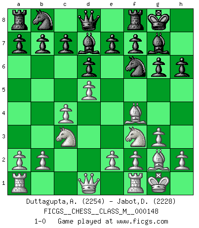 Last move : 1-0 2025 February 10 14:35:7 [Event "FICGS__CHESS__CLASS_M__000148"] [Site "FICGS"] [Date "2024.12.24"] [Round "1"] [White "Duttagupta,Aniruddha"] [Black "Jabot,Daniel"] [Result "1-0"] [WhiteElo "2254"] [BlackElo "2228"] 1.d4 Nf6 2.c4 g6 3.g3 Bg7 4.Bg2 O-O 5.Nc3 d6 6.Nf3 Nc6 7.d5 Nb8 8.O-O Bd7 9.Bg5 h6 10.Bf4 1-0 This chess game has been lost on time (started : 2024.12.24 6:41:52) Follow this game move after move (download)Chess is above all, a fight ! (Emanuel Lasker) Woher wissen wir, daß der Neanderthaler Blindschach gespielt hat? -- Bei Ausgrabungen wurden keine Schachbretter und Figuren gefunden. (Anonymous) Una buena ofensiva y una buena defensa, comienzan ambas con un buen desarrollo. (Bruce A. Moon) Donnez-moi un Cavalier en 6e et je gagnerais toutes mes parties. (Steinitz) Industry executives and analysts often mistakenly talk about strategy as if it were some kind of chess match. But in chess, you have just two opponents, each with identical resources, and with luck playing a minimal role. The real world is much more like a poker game, with multiple players trying to make the best of whatever hand fortune has dealt them. In our industry, Bill Gates owns the table until someone proves otherwise. (David Moschella, 'Computerworld')