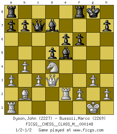 Last move : 1/2-1/2 2025 May 24 15:12:34 [Event "FICGS__CHESS__CLASS_M__000148"] [Site "FICGS"] [Date "2024.12.24"] [Round "1"] [White "Dyson,John"] [Black "Bussoli,Marco"] [Result "1/2-1/2"] [WhiteElo "2227"] [BlackElo "2269"] 1.e4 e6 2.d4 d5 3.e5 c5 4.c3 Qb6 5.Nf3 Nc6 6.a3 Nh6 7.Bd3 Bd7 8.dxc5 Bxc5 9.O-O Ng4 10.Qe2 f6 11.exf6 gxf6 12.b4 Bd6 13.Bb2 Qc7 14.g3 Nce5 15.Nbd2 Nxd3 16.Qxd3 Ne5 17.Nxe5 Bxe5 18.Rfe1 O-O 19.Nf3 Bd6 20.Nd4 Be5 21.Nf3 Bd6 22.Nd4 Be5 23.Re2 1/2-1/2 Follow this game move after move (download)I look one move ahead... the best ! (Siegbert Tarrasch) Wer sich die Fähigkeit anerziehen will im Schach selbstständig zu denken, der muß alles meiden, was leblos ist: ausgeklügelte Theorien, die sich auf sehr wenige Beispiele und eine Menge Hirngespinste stützen. (Emanuel Lasker) Los tropiezos estan todos ahí en el tablero, esperando que se cometan. (Savielly Tartakover) J'ai vu le vaincu d'Echecs jouer des années durant dans l'espoir de la fête de la victoire. Car tu es plus riche de ce qu'elle existe si même elle n'est point pour toi. Ainsi de la perle du fond des mers. (Antoine de Saint-Exupéry) Man is still the most extraordinary computer of all. (John F. Kennedy)