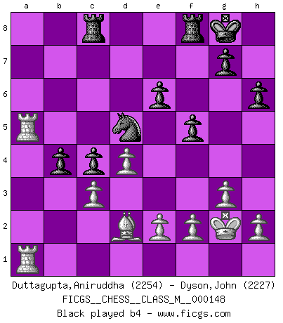 Last move : 1-0 2025 July 18 20:56:29 [Event "FICGS__CHESS__CLASS_M__000148"] [Site "FICGS"] [Date "2024.12.24"] [Round "1"] [White "Duttagupta,Aniruddha"] [Black "Dyson,John"] [Result "1-0"] [WhiteElo "2254"] [BlackElo "2227"] 1.c4 e6 2.g3 d5 3.Bg2 Nf6 4.Nf3 dxc4 5.Qa4+ Bd7 6.Qxc4 c5 7.Ne5 Qc8 8.Nxd7 Qxd7 9.Nc3 Nc6 10.O-O Be7 11.d3 Rc8 12.a4 b6 13.Bxc6 Qxc6 14.a5 O-O 15.Qb5 Nd5 16.Qxc6 Rxc6 17.axb6 axb6 18.Bd2 Bf6 19.Rfc1 h6 20.Ra2 Bxc3 21.bxc3 c4 22.d4 f5 23.Kg2 R6c8 24.Rca1 b5 25.Ra5 b4 26.cxb4 c3 27.Bc1 Nxb4 28.Ba3 Nc6 29.Ra4 Rfd8 30.e3 1-0 This chess game has been lost on time (started : 2024.12.24 6:41:52) Follow this game move after move (download)Chess mastery essentially consists of analyzing Chess positions accurately. (Mikhail Botvinnik) Die Elozahlen sind sehr schlecht für das Schach. Jetzt ist Schach eine Sportindustrie, die darauf zielt Elopunkte zu machen. (Miguel Najdorf) En la perfecta combinación de Ajedrez como en una historia corta de primera clase, toda la trama y contra trama deberá conducir hacia un final sorprendente, el interes no es mitigado hasta el último momento. (Yates and Winter) Les échecs sont utiles à l'exercice de la faculté de penser et à celle de l'imagination. Car nous devons posséder une méthode élaborée pour atteindre des buts partout où nous devons conduire notre raison. (Leibnitz) Luck never gives; it only lends. (Swedish proverb)