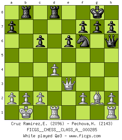 Last move : 1-0 2025 June 28 1:13:41 [Event "FICGS__CHESS__CLASS_A__000285"] [Site "FICGS"] [Date "2024.12.25"] [Round "1"] [White "Cruz Ramirez,Eliecer"] [Black "Pechova,Hana"] [Result "1-0"] [WhiteElo "2096"] [BlackElo "2143"] 1.e4 e6 2.d4 d5 3.Nc3 Nf6 4.Bg5 dxe4 5.Nxe4 Be7 6.Nxf6+ Bxf6 7.Bxf6 Qxf6 8.Nf3 O-O 9.Qd3 Rd8 10.O-O-O Nd7 11.Qe4 Qh6+ 12.Kb1 Rb8 13.g4 Nf6 14.Qe5 Nxg4 15.Qxc7 Bd7 16.Qg3 Nf6 17.Ne5 Ne4 18.Qf3 Nf6 19.Bg2 Bc6 20.Nxc6 bxc6 21.Qe3 Qxe3 22.fxe3 Ng4 23.Rde1 Rdc8 24.e4 c5 25.Bf3 1-0 This chess game has been lost on time (started : 2024.12.25 22:56:0) Follow this game move after move (download)Only the player with the initiative has the right to attack. (Wilhelm Steinitz) Gewöhnliche Menschen denken nur daran, wie sie ihre Zeit verbringen. Ein intelligenter Mensch versucht, sie auszunutzen. (Arthur Schopenhauer) Hoy en día, si tu no eres un Gran Maestro a los 14 años, es mejor que lo olvides. (Anand Viswanathan) Le thème de l'attaque double intervient d'une manière ou d'une autre dans l'immense majorité des combinaisons. (Youri Averbakh) Quotation,n.: The act of repeating erroneously the words of another. The words erroneously repeated. (Ambrose Bierce, The Devil's Dictionary)