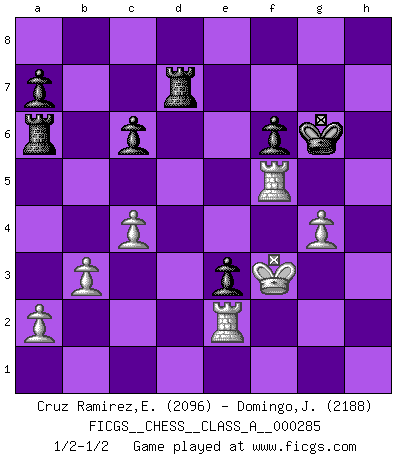 Last move : 1/2-1/2 2025 February 17 16:36:54 [Event "FICGS__CHESS__CLASS_A__000285"] [Site "FICGS"] [Date "2024.12.25"] [Round "1"] [White "Cruz Ramirez,Eliecer"] [Black "Domingo,Jordi"] [Result "1/2-1/2"] [WhiteElo "2096"] [BlackElo "2188"] 1.e4 e5 2.Nf3 Nc6 3.Bb5 f5 4.Nc3 fxe4 5.Nxe4 Nf6 6.Qe2 Qe7 7.O-O d5 8.Nxf6+ gxf6 9.d4 e4 10.Nh4 Bd7 11.Qh5+ Qf7 12.Qxf7+ Kxf7 13.f3 Rd8 14.Bxc6 Bxc6 15.fxe4 dxe4 16.Be3 Bd7 17.Rf2 Bg7 18.b3 h5 19.Raf1 Rhe8 20.c4 Bc8 21.Nf5 Bxf5 22.Rxf5 Kg6 23.R1f2 Re6 24.Kf1 Ra6 25.h3 Rd7 26.g4 hxg4 27.hxg4 Bh6 28.Bxh6 Kxh6 29.d5 Kg6 30.Kg2 e3 31.Re2 c6 32.dxc6 bxc6 33.Kf3 1/2-1/2 Follow this game move after move (download)It is not enough to be a good player... you must also play well. (Siegbert Tarrasch) Es ist schade, dass viele Schachsportler vergessen, wie wichtig Auftreten und angemessene Kleidung sind. (Alexandra Kosteniuk) Ser exitoso en el Ajedrez te permite descubrir tu propia personalidad. Eso es lo que deseo para los niños de mi clase. (Saudin Robovic) D'abord les bases : Jouez et étudiez, puis étudiez et jouez, ensuite jouez et étudiez, puis étudiez et jouez. Deuxièmement : Donnez toujours le meilleur de vous-même ! (Ken Smith) Methinks King Thibault should dub Marius Zubac a knight of the square board... I mean table, henceforth addressing him as Sir Marius, and bestow on him a suitable land from the kingdom of FICGS & marry him off to a worthy, fair maiden, lest he slice our heads with his mighty sword in his wrath. (Dinesh De Silva)