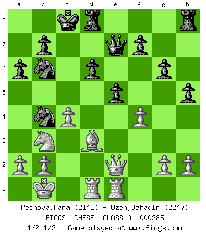 Last move : 1/2-1/2 2025 May 8 17:41:42 [Event "FICGS__CHESS__CLASS_A__000285"] [Site "FICGS"] [Date "2024.12.25"] [Round "1"] [White "Pechova,Hana"] [Black "Ozen,Bahadir"] [Result "1/2-1/2"] [WhiteElo "2143"] [BlackElo "2247"] 1.e4 c5 2.Nf3 d6 3.d4 cxd4 4.Nxd4 Nf6 5.Nc3 a6 6.Be3 e5 7.Nb3 Be6 8.f3 h5 9.Qd2 Nbd7 10.Nd5 Bxd5 11.exd5 g6 12.O-O-O Nb6 13.Kb1 Nbxd5 14.Bg5 Be7 15.Bd3 Qc7 16.Rhe1 Nb6 17.f4 O-O-O 18.Qe2 Nfd5 19.c4 Nb4 20.Bxe7 Qxe7 1/2-1/2 Follow this game move after move (download)There is no remorse like the remorse of Chess. (H. G. Wells) Du kannst im Schach nur gut werden, wenn du das Spiel liebst. (Robert James Fischer) No hay otro maestro que tenga una voluntad terrífica de ganar. Al tablero, el irradía peligro y aún los oponentes mas fuertes tienden a congelarse como liebres cuando olfatean a una pantera. Aún sus debilidades son peligrosas. Con las blancas, su juego de apertura es predecible - te es posible hacer planes en su contra - pero es tan fuerte que tus planes casi nunca funcionan. En el juego medio, su precisión e invención son fabulosas y en finales, tú simplemente no le puedes vencer. (Experto Alemán anónimo) Les échecs sont un jeu par leur forme, un art par leur essence et une science par sa difficulté d'acquisition. Ils peuvent vous procurer autant de plaisir qu'un bon livre ou une belle musique, mais vous n'aurez une réelle joie que si vous arrivez à bien jouer. (Tigran Petrosian) When you have everything, sometimes it feels like nothing. (Horatio Caine, C.S.I. Miami)