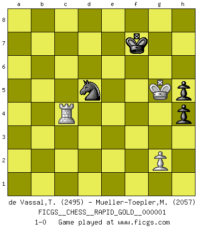 Last move : 1-0 2007 December 4 13:48:24 [Event "FICGS__CHESS__RAPID_GOLD__000001"] [Site "FICGS"] [Date "2007.09.24"] [Round "1"] [White "de Vassal,Thibault"] [Black "Mueller-Toepler,Michael"] [Result "1-0"] [WhiteElo "2495"] [BlackElo "2057"] 1.d4 Nf6 2.c4 e6 3.Nc3 d5 4.Nf3 c6 5.e3 Nbd7 6.Bd3 dxc4 7.Bxc4 b5 8.Bd3 Bb7 9.O-O a6 10.e4 c5 11.d5 Qc7 12.dxe6 fxe6 13.Bc2 c4 14.Nd4 Nc5 15.Be3 e5 16.Nf3 Be7 17.Ng5 O-O 18.Bxc5 Bxc5 19.Ne6 Qb6 20.Nxf8 Rxf8 21.Qe2 Qe6 22.a4 Ng4 23.Nd1 Nf6 24.axb5 axb5 25.h3 Qf7 26.Ra5 Bc6 27.Ba4 Bxe4 28.Bxb5 Bd3 29.Qxe5 Bb6 30.Ra6 Bc7 31.Qe6 Qxe6 32.Rxe6 Rb8 33.Ba6 Bh2+ 34.Kxh2 Bxf1 35.Rc6 c3 36.bxc3 Bxa6 37.Rxa6 Rd8 38.Ra1 Rd2 39.c4 Rc2 40.Ne3 Rxf2 41.c5 Re2 42.c6 Rxe3 43.c7 Rc3 44.Ra8+ Kf7 45.c8Q Rxc8 46.Rxc8 g5 47.Kg3 Kg6 48.Kf3 Kf5 49.Rc5+ Kg6 50.Ke3 h6 51.Rc6 h5 52.h4 gxh4 53.Kf4 Kf7 54.Kg5 Nd5 55.Rc4 1-0 Queen's pawn game Kingside Castling by player White (move 9) Kingside Castling by player Black (move 17) 10 pieces endgame at move 42 : White KRPPP , Black KRNPP WHITE : King + 1 Rook 3 Pawns BLACK : King + 1 Rook 1 Knight 2 Pawns Promotion Queen by player White (move 45) 9 pieces endgame at move 45 : White KRPP , Black KRNPP WHITE : King + 1 Rook 2 Pawns BLACK : King + 1 Rook 1 Knight 2 Pawns 8 pieces endgame at move 46 : White KRPP , Black KNPP WHITE : King + 1 Rook 2 Pawns BLACK : King + 1 Knight 2 Pawns 7 pieces endgame at move 52 : White KRP , Black KNPP WHITE : King + 1 Rook 1 Pawn BLACK : King + 1 Knight 2 Pawns Player White won this chess game. Follow this game move after move (download)Chess teaches you to control the initial excitement you feel when you see something that looks good and it trains you to think objectively when you're in trouble. (Stanley Kubrick) Ohne ihre Erfolge schmälern zu wollen würde ich sagen Petrosian, Spassky und Karpov verdanken ihre Siege ihren Trainern - Boleslavsky, Bondarevsky und Furman. (Mikhail Moiseyevich Botvinik) Tu cuerpo tiene que estar en óptima condición. Tu Ajedrez se deteriora como lo hace tu cuerpo. No puedes separar la mente y el cuerpo. (Bobby Fischer) L'action d'une oeuvre littéraire se déroule sur un champ de bataille. Les masques et les types du drame moderne correspondent aux pièces du jeu d'échecs. L'intrigue correspond aux coups et aux gambits, c'est à dire aux techniques du jeu telles qu'utilisées et interprétées par les joueurs. Les tactiques et les péripéties [mouvements] correspondent aux coups exécutés par l'adversaire. (Viktor Shklovsky) A good aphorism is too hard for the tooth of time, and is not worn away with the centuries, although it serves as food for every speech. (Friedrich Nietzsche)
