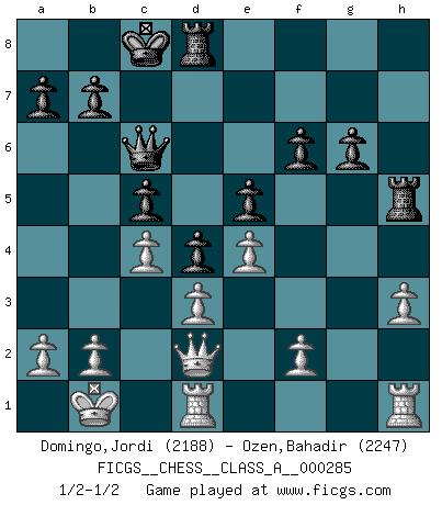 Last move : 1/2-1/2 2025 January 29 20:9:10 [Event "FICGS__CHESS__CLASS_A__000285"] [Site "FICGS"] [Date "2024.12.25"] [Round "1"] [White "Domingo,Jordi"] [Black "Ozen,Bahadir"] [Result "1/2-1/2"] [WhiteElo "2188"] [BlackElo "2247"] 1.e4 c5 2.Nf3 d6 3.c3 Nf6 4.Bd3 Bg4 5.Bc2 d5 6.d3 Nc6 7.h3 Bh5 8.Bg5 h6 9.Bxf6 gxf6 10.Nbd2 e6 11.Qe2 Qd6 12.O-O-O d4 13.c4 O-O-O 14.g4 Bg6 15.Nh4 h5 16.Nxg6 fxg6 17.Ba4 Bh6 18.Bxc6 Qxc6 19.Kb1 e5 20.gxh5 Bxd2 21.Qxd2 Rxh5 1/2-1/2 Follow this game move after move (download)You may learn much more from a game you lose than from a game you win. You will have to lose hundreds of games before becoming a good player. (Jose Raul Capablanca) Wenn du gegen Bobby spielst, ist es keine Frage von gewinnen oder verlieren. Es ist eine Frage des Überlebens. (Boris Vassilievich Spassky) Un mal plan es mejor que no tener ningún plan. (Frank Marshall) Toutes choses étant égales, c'est la conviction qui gagne. Alliée à une volonté de vaincre, elle sert de détonateur, suscite des idées, disperse les doutes et aide à penser clairement. (Robert Fischer) Nowadays, anyone who cannot speak English and is incapable of using the Internet is regarded as backward. (Al-Waleed bin Talal)