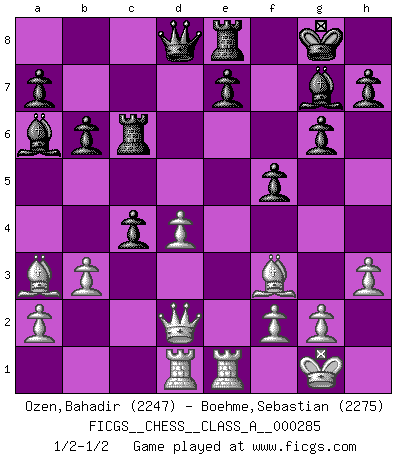 Last move : 1/2-1/2 2025 February 12 17:44:31 [Event "FICGS__CHESS__CLASS_A__000285"] [Site "FICGS"] [Date "2024.12.25"] [Round "1"] [White "Ozen,Bahadir"] [Black "Boehme,Sebastian"] [Result "1/2-1/2"] [WhiteElo "2247"] [BlackElo "2275"] 1.Nf3 d5 2.d4 Nf6 3.c4 c6 4.Nc3 g6 5.e3 Bg7 6.Be2 O-O 7.O-O b6 8.b3 Ne4 9.Qc2 Nxc3 10.Qxc3 Bb7 11.Ba3 c5 12.Rad1 Nc6 13.Qd2 cxd4 14.exd4 Re8 15.h3 Rc8 16.Rfe1 Ba6 17.Ne5 dxc4 18.Bg4 f5 19.Nxc6 Rxc6 20.Bf3 1/2-1/2 Follow this game move after move (download)Only sissies Castle. (Rob Sillars) Ich könnte leicht behaupten: Ja,ja, Leonid Breschnew wollte nicht, daß ich Weltmeister werde. In der Tat war die Sache komplizierter. (Viktor Kortschnoi) Un juego de Ajedrez es un dialogo, una conversación entre un jugador y su oponente. Cada movimiento del oponente puede contener amenazas o tropiezos, pero un jugador no se puede defender de las amenazas o tomar ventaja de los tropiezos si es que no se pregunta a sí mismo: ¿Que es lo que mi oponente va a hacer después de cada movida?. (Bruce A. Moon) Je ne crois pas en la psychologie, je crois aux bons coups. (Robert Fischer) Men never do evil so completely and cheerfully as when they do it from religious conviction. (Blaise Pascal)