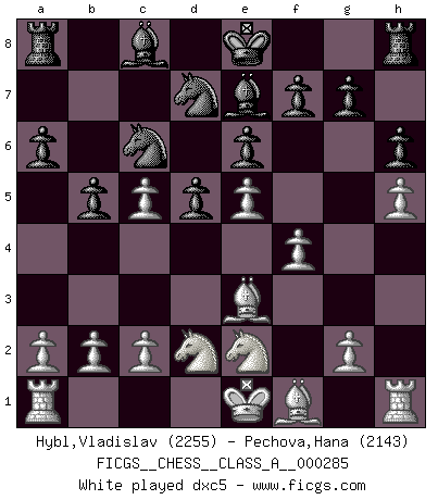 Last move : 1-0 2025 June 29 21:33:50 [Event "FICGS__CHESS__CLASS_A__000285"] [Site "FICGS"] [Date "2024.12.25"] [Round "1"] [White "Hybl,Vladislav"] [Black "Pechova,Hana"] [Result "1-0"] [WhiteElo "2255"] [BlackElo "2143"] 1.e4 e6 2.d4 d5 3.Nc3 Nf6 4.e5 Nfd7 5.f4 c5 6.Nf3 Nc6 7.Be3 a6 8.Qd2 b5 9.h4 Qa5 10.h5 h6 11.Ne2 Qxd2+ 12.Nxd2 Be7 13.dxc5 Nxc5 14.Nd4 Bd7 15.N4b3 Nxb3 16.Nxb3 1-0 This chess game has been lost on time (started : 2024.12.25 22:56:0) Follow this game move after move (download)Fischer is under obligation to nobody. (Joseph Platz) Stil? Ich habe keinen Stil! (Anatoly Karpov) El Ajedrez es parte de una cultura y si una cultura esta en decadencia, entonces también el Ajedrez declinará. (Mikhail Botvinnik) Un millionnaire : 'Monsieur Steinitz ! Vous ne participez aux tournois que pour l'argent, alors que moi je n'y viens que pour l'honneur.' Steinitz : 'Chacun joue pour ce qu'il n'a pas'... I've never seen so many men wasted so badly. (Blondie in The Good, The Bad and The Ugly)
