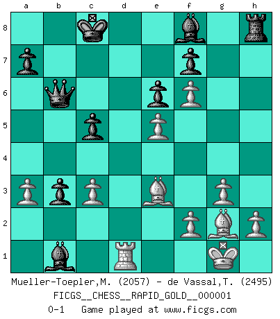 Last move : 0-1 2007 October 19 13:41:47 [Event "FICGS__CHESS__RAPID_GOLD__000001"] [Site "FICGS"] [Date "2007.09.24"] [Round "2"] [White "Mueller-Toepler,Michael"] [Black "de Vassal,Thibault"] [Result "0-1"] [WhiteElo "2057"] [BlackElo "2495"] 1.d4 d5 2.c4 c6 3.Nc3 Nf6 4.Nf3 e6 5.Bg5 dxc4 6.e4 b5 7.e5 h6 8.Bh4 g5 9.Nxg5 hxg5 10.Bxg5 Nbd7 11.g3 Bb7 12.Bg2 Qb6 13.exf6 O-O-O 14.O-O Ne5 15.dxe5 Rxd1 16.Rfxd1 b4 17.Ne4 c5 18.a3 c3 19.bxc3 b3 20.Rab1 Bxe4 21.Be3 Bxb1 0-1 QGD Slav defense Queenside Castling by player Black (move 13) Kingside Castling by player White (move 14) Player Black won this chess game. Follow this game move after move (download)Suddenly it was obvious to me in my analysis I had missed what Fischer had found with the greatest of ease at the board. (Mikhail Botvinnik) Ein Isolani verdüstert die Stimmung auf dem ganzen Schachbrett. (Savielly Grigorievitsch Tartakower) Nada excita más a Grandes Maestros aburridos que una novedad teórica. (Dominic Lawson) A ce moment-là, je menaçais de comprendre la position ! (Clément L'Heureux) All men can see these tactics whereby I conquer, but what none can see is the strategy out of which victory is evolved. (Sun Tzu)