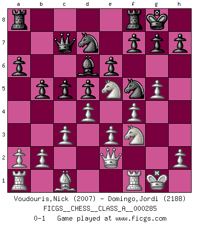 Last move : 0-1 2025 February 2 23:7:51 [Event "FICGS__CHESS__CLASS_A__000285"] [Site "FICGS"] [Date "2024.12.25"] [Round "1"] [White "Voudouris,Nick"] [Black "Domingo,Jordi"] [Result "0-1"] [WhiteElo "2007"] [BlackElo "2188"] 1.d4 d5 2.e3 Nf6 3.f4 c5 4.c3 Bg4 5.Nf3 e6 6.Bd3 Nc6 7.O-O Bd6 8.Qe1 Bf5 9.Qe2 Qc7 10.Ne5 O-O 11.Nd2 Ne7 12.g4 Bxd3 13.Nxd3 a6 14.Ne5 b5 15.g5 Nd7 16.Ndf3 Nf5 0-1 Follow this game move after move (download)Chess is a beautiful mistress. (Bent Larsen) Woher wissen wir, daß der Neanderthaler Blindschach gespielt hat? -- Bei Ausgrabungen wurden keine Schachbretter und Figuren gefunden. (Anonymous) Botvinnik trataba de restarle el misterio al Ajedrez, siempre relacionandolo a situaciones de la vida ordinaria. El gustaba de llamar al Ajedrez un típico problema inexacto similar a aquellos de los cuales la gente siempre tiene que enfrentarse en la vida cotidiana. (Garry Kasparov) Les ravages du H expliquent la différence de niveau entre Tal et Thal [Abergel]. To send light into the darkness of men's hearts - such is the duty of the artist. (Schumann)