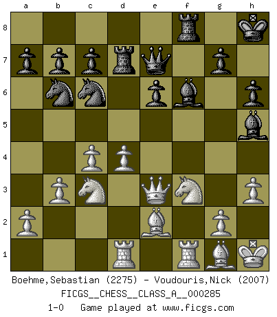 Last move : 1-0 2025 February 2 23:8:37 [Event "FICGS__CHESS__CLASS_A__000285"] [Site "FICGS"] [Date "2024.12.25"] [Round "1"] [White "Boehme,Sebastian"] [Black "Voudouris,Nick"] [Result "1-0"] [WhiteElo "2275"] [BlackElo "2007"] 1.e4 Nf6 2.e5 Nd5 3.c4 Nb6 4.d4 d6 5.f4 dxe5 6.fxe5 Nc6 7.Be3 Bf5 8.Nc3 e6 9.Be2 Be7 10.Nf3 O-O 11.O-O f6 12.exf6 Bxf6 13.Qd2 Qe7 14.Rad1 Rad8 15.Kh1 Bg6 16.Qc1 h6 17.h3 Kh8 18.b3 Rd7 19.Bg1 Bh5 20.Nh4 Bf7 21.Nf3 Bh5 22.Qe3 1-0 Follow this game move after move (download)Chess is a part of culture and if a culture is declining then Chess too will decline. (Mikhail Botvinnik) Es gibt Leute, die glauben, alles wäre vernünftig, was man mit einem ernsthaften Gesicht tut. (Georg Christoph Lichtenberg) Ser exitoso en el Ajedrez te permite descubrir tu propia personalidad. Eso es lo que deseo para los niños de mi clase. (Saudin Robovic) Les échecs sont utiles à l'exercice de la faculté de penser et à celle de l'imagination. Car nous devons posséder une méthode élaborée pour atteindre des buts partout où nous devons conduire notre raison. (Leibnitz) The faster the computer, the slower the brain. (Thibault de Vassal)
