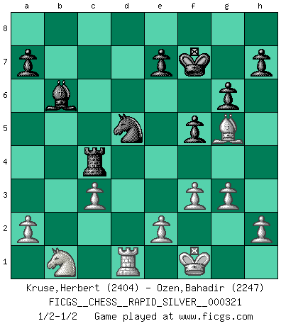 Last move : 1/2-1/2 2025 February 6 15:27:1 [Event "FICGS__CHESS__RAPID_SILVER__000321"] [Site "FICGS"] [Date "2024.12.26"] [Round "1"] [White "Kruse,Herbert"] [Black "Ozen,Bahadir"] [Result "1/2-1/2"] [WhiteElo "2404"] [BlackElo "2247"] 1.g3 d5 2.Nf3 g6 3.d4 Nf6 4.Bg2 Bg7 5.O-O O-O 6.c4 dxc4 7.Na3 c5 8.dxc5 c3 9.Nd4 Ne4 10.Bxe4 Qxd4 11.Qxd4 Bxd4 12.bxc3 Bxc5 13.Rb1 Nd7 14.Bxb7 Rb8 15.Bxc8 Rfxc8 16.Rxb8 Rxb8 17.Nc4 Rc8 18.Nd2 Bb6 19.Nb1 f5 20.Bg5 Kf7 21.Rc1 Ne5 22.Kg2 Ng4 23.f3 Ne3+ 24.Kf2 Nd5 25.Kf1 Rc4 26.Rd1 1/2-1/2 Follow this game move after move (download)The blunders are all there on the board, waiting to be made. (Savielly Tartakover) Kombinieren und Schwarzhandel gehören verboten. (Savielly Grigorievitsch Tartakower) ¡Examina movidas que hagan daño! Un buen ojo for movidas desvastantes es mucho mas importante que el conocimiento de principios estratégicos. (Purdy) La tactique est l'élément le plus important du milieu de jeu. (Siegbert Tarrasch) Life doesn't imitate art, it imitates bad television. (Woody Allen)