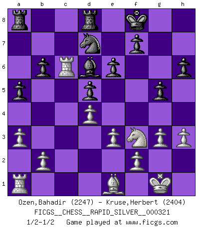 Last move : 1/2-1/2 2025 January 27 13:59:43 [Event "FICGS__CHESS__RAPID_SILVER__000321"] [Site "FICGS"] [Date "2024.12.26"] [Round "2"] [White "Ozen,Bahadir"] [Black "Kruse,Herbert"] [Result "1/2-1/2"] [WhiteElo "2247"] [BlackElo "2404"] 1.d4 Nf6 2.c4 e6 3.Nf3 d5 4.g3 Bb4+ 5.Bd2 Be7 6.Bg2 O-O 7.O-O c6 8.Qc2 Nbd7 9.Rc1 h6 10.e3 a5 11.a3 b6 12.cxd5 cxd5 13.Bf1 Bb7 14.Qc7 Ba6 15.Bxa6 Rxa6 16.Qxd8 Rxd8 17.Nc3 g5 18.h3 Ne4 19.Nb5 R6a8 20.Rc7 Kf8 21.Be1 Nd6 22.Nxd6 Bxd6 23.Rc6 1/2-1/2 Follow this game move after move (download)One doesn't have to play well, it's enough to play better than your opponent. (Siegbert Tarrasch) Ein Gewinn durch eine ungenaue Kombination, sei sie auch noch so vorzeigbar, erfüllt mich mit Schaudern. (Wilhelm Steinitz) El jugador blanco perdió porque fallo en recordar la coreccta continuación y tuvo que pensar por sí mismo las movidas. (Siegbert Tarrasch) Celui qui prend des risques peut perdre, celui qui n'en prend pas perd toujours. (Xavier Tartacover) The beginning is the most important part of the work. (Plato)