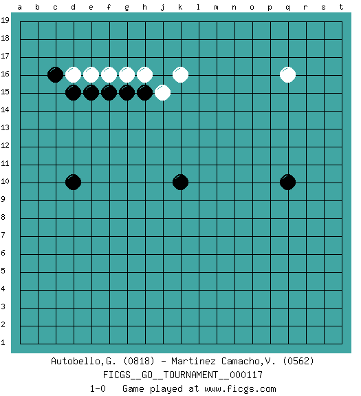 Last move : 1-0 2025 February 25 14:41:8 [Event "FICGS__GO__TOURNAMENT__000117"] [Site "FICGS"] [Date "2024.12.27"] [Round "1"] [Black "Autobello,Giovanni"] [White "Martinez Camacho,Victor Hugo"] [Result "1-0"] [Rating 1 "0818"] [Rating 2 "0562"] 1.k10 k16 2.d10 d16 3.q10 q16 4.e15 f16 5.g15 g16 6.f15 h16 7.h15 j15 8.d15 e16 9.c16 1-0 This go game has been lost on time (started : 2024.12.27 5:43:15) Follow this game move after move (download)Extend one hand from the cutting points. (Anonymous) The Internet is so big, so powerful and pointless that for some people it is a complete substitute for life. (Andrew Brown)
