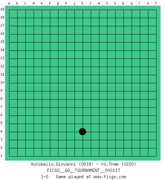 Last move : 1-0 2025 January 28 1:57:7 [Event "FICGS__GO__TOURNAMENT__000117"] [Site "FICGS"] [Date "2024.12.27"] [Round "1"] [Black "Autobello,Giovanni"] [White "Vo,Tham"] [Result "1-0"] [Rating 1 "0818"] [Rating 2 "0220"] 1.k4 1-0 This go game has been lost on time (started : 2024.12.27 5:43:15) Follow this game move after move (download)Six eyes in a rectangle are alive. (Anonymous) The only sure thing about luck is that it will change. (Wilson Mizner)