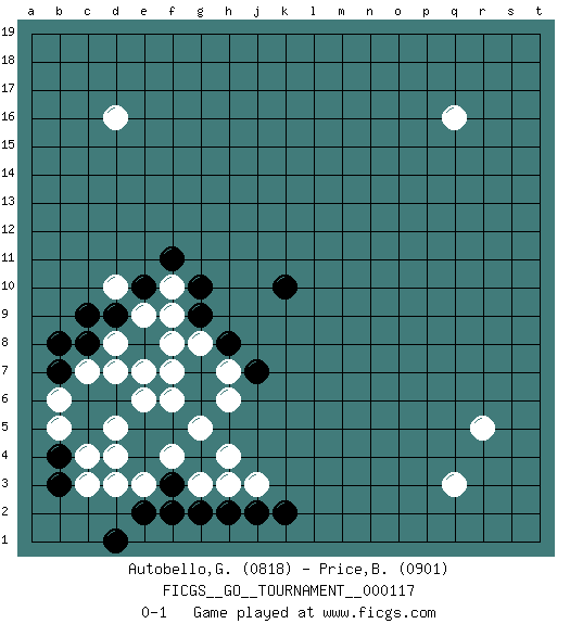 Last move : 0-1 2025 March 18 7:32:4 [Event "FICGS__GO__TOURNAMENT__000117"] [Site "FICGS"] [Date "2024.12.27"] [Round "1"] [Black "Autobello,Giovanni"] [White "Price,Brennan"] [Result "0-1"] [Rating 1 "0818"] [Rating 2 "0901"] 1.k10 d4 2.e4 d5 3.e5 e6 4.d6 d7 5.c6 c7 6.b7 e3 7.f3 c3 8.e2 d3 9.d1 f6 10.c5 f4 11.f5 g5 12.g4 g3 13.f2 h4 14.g2 j3 15.h2 h3 16.j2 q3 17.k2 r5 18.c8 d8 19.c9 b5 20.b4 b6 21.b8 c4 22.b3 q16 23.d9 d16 24.e8 e9 25.e10 f9 26.f8 f10 27.f11 g8 28.g7 f7 29.g9 e7 30.h8 f8 31.g10 h7 32.g6 h6 33.j7 d10 0-1 This go game has been lost on time (started : 2024.12.27 5:43:15) Follow this game move after move (download)Josekis are not fixed, definitive things. They indicate the moments when everything can change. (Pierre Audouard) When you stop learning you start dying. (M. Scott Adams)
