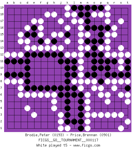 Last move : 0-1 2025 July 17 10:46:1 [Event "FICGS__GO__TOURNAMENT__000117"] [Site "FICGS"] [Date "2024.12.27"] [Round "1"] [Black "Brodie,Peter"] [White "Price,Brennan"] [Result "0-1"] [Rating 1 "0193"] [Rating 2 "0901"] 1.k10 d4 2.q10 d16 3.d10 q17 4.q4 k16 5.k4 c6 6.d9 e3 7.k7 r15 8.q16 r16 9.p15 q15 10.p16 q18 11.o16 q12 12.q11 p13 13.p14 q14 14.o14 m15 15.o13 m13 16.o12 m11 17.o11 d13 18.p11 k12 19.n12 m12 20.o10 n15 21.n16 m16 22.n17 m9 23.l10 m10 24.l9 l8 25.k8 m7 26.l7 m8 27.l6 o8 28.m6 n6 29.m5 n5 30.m4 n4 31.m3 n3 32.m2 n2 33.m1 n1 34.k9 p9 35.q9 q8 36.r9 r8 37.s9 s8 38.t9 s11 39.n18 t8 40.n19 m17 41.m19 k18 42.l11 l12 43.k11 n13 44.p12 q13 45.j11 h13 46.j12 j13 47.h12 f13 48.g12 g13 49.f12 r3 50.r4 q3 51.p4 p3 52.o4 o3 53.s4 s3 54.t3 t2 55.t4 s1 56.o5 p6 57.o6 o7 58.p5 q6 59.r6 s6 60.r5 r7 61.s5 t6 62.q7 p7 63.o9 p18 64.n9 n8 65.e12 e13 66.d12 c12 67.d11 c8 68.d8 c7 69.d7 d6 70.e7 e6 71.f7 f6 72.g7 g6 73.h7 h6 74.j7 h4 75.k5 j3 76.k3 j2 77.k2 k1 78.l2 j1 79.c11 b12 80.b11 c14 81.a11 a12 82.k6 e17 83.p10 r12 84.p8 s17 85.m18 l18 86.l19 k19 87.t10 s10 88.t11 t12 89.s12 s13 90.o19 o18 91.p19 q19 92.n14 m14 93.r11 s12 94.e16 f16 95.e15 f15 96.d15 c15 97.f14 d14 98.g15 g14 99.g16 f17 100.h16 j17 101.h17 h18 102.g17 g18 103.j16 j15 104.k17 l17 105.k15 k14 106.h14 h15 107.t7 q5 108.j6 h5 109.c9 b8 110.b9 a8 111.a9 t5 112.a13 b13 113.a14 b14 114.a15 b16 115.c16 c17 116.a17 c3 117.c4 b4 118.c5 b5 119.e5 d5 120.f5 j4 121.f4 f3 122.g3 g2 123.h3 h2 124.a18 s18 125.b19 c18 126.c19 d18 127.e18 e19 128.f18 f19 129.h19 t16 130.r18 r19 131.l1 r17 132.t4 s7 133.s4 r4 134.t3 s5 135.j19 t18 0-1 Follow this game move after move (download)The strong player plays straight, the weak diagonally. (Anonymous) This is where the fun begins. (Anakin Skywalker in Star Wars ep.3)