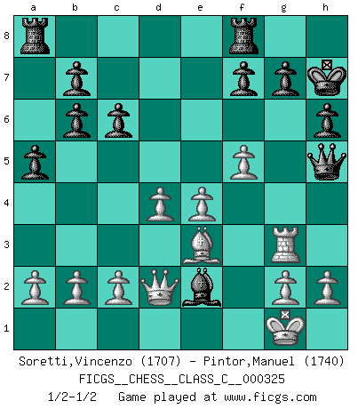 Last move : 1/2-1/2 2025 January 22 0:58:38 [Event "FICGS__CHESS__CLASS_C__000325"] [Site "FICGS"] [Date "2024.12.28"] [Round "1"] [White "Soretti,Vincenzo"] [Black "Pintor,Manuel"] [Result "1/2-1/2"] [WhiteElo "1707"] [BlackElo "1740"] 1.e4 e5 2.Nf3 Nc6 3.Bb5 Qf6 4.Nc3 Qg6 5.O-O Bc5 6.Bxc6 dxc6 7.Nxe5 Qf6 8.d4 Bb6 9.Be3 Ne7 10.Qd2 h6 11.f4 O-O 12.Na4 a5 13.Nxb6 cxb6 14.Rf3 Ng6 15.Nxg6 Qxg6 16.Qd3 Bg4 17.Rg3 Qh5 18.Rd1 Bxd1 19.f5 Be2 20.Qd2 Kh7 21.Rh3 Qg4 22.Rg3 Qh5 23.Rh3 Qg4 24.Rg3 Qh5 1/2-1/2 Follow this game move after move (download)Chess, like love, like music, has the power to make people happy. (Siegbert Tarrasch) Als ich elf wurde, wurde ich einfach gut. (Robert James Fischer) El Ajedrez es imaginación. (David Bronstein) J'ai toujours senti une vague pitié pour l'homme qui ne connaît rien aux échecs, tout comme j'en aurais pour un homme ignorant de l'amour. Les Echecs, comme la musique ou comme l'amour, ont le pouvoir de rendre heureux. (Siegbert Tarrasch) Memory is a crazy woman that hoards colored rags and throws away food. (Austin O'Malley)