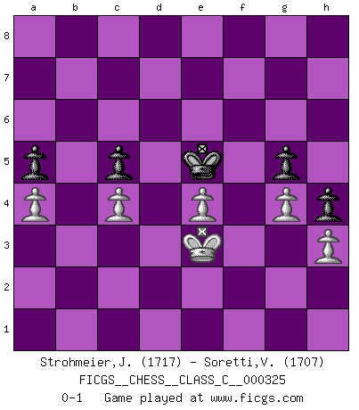 Last move : 0-1 2025 March 15 9:40:2 [Event "FICGS__CHESS__CLASS_C__000325"] [Site "FICGS"] [Date "2024.12.28"] [Round "1"] [White "Strohmeier,Josef"] [Black "Soretti,Vincenzo"] [Result "0-1"] [WhiteElo "1717"] [BlackElo "1707"] 1.e4 e5 2.Nf3 Nc6 3.Bb5 d6 4.d4 Bd7 5.O-O a6 6.Ba4 Nf6 7.Nc3 Be7 8.Re1 O-O 9.Bxc6 Bxc6 10.dxe5 dxe5 11.Bg5 Qxd1 12.Raxd1 h6 13.Bh4 Rfe8 14.Nxe5 Rad8 15.Nxc6 bxc6 16.Bg3 Rxd1 17.Nxd1 Rc8 18.f3 Bc5+ 19.Kf1 Bb6 20.Ne3 Rd8 21.Ke2 Nh5 22.Nf5 Nxg3+ 23.Nxg3 g6 24.Nf1 f6 25.Rd1 Rxd1 26.Kxd1 Kf7 27.Kd2 Ke6 28.Ne3 Bd4 29.c3 Bc5 30.Kd3 a5 31.b3 h5 32.Nc4 Bb6 33.h3 g5 34.g4 h4 35.Nxb6 cxb6 36.Ke3 Ke5 37.a3 b5 38.a4 bxa4 39.bxa4 c5 40.c4 Ke6 41.Kd3 Kd7 42.Ke3 Kd6 43.f4 Ke6 44.Kf3 Kd6 45.Ke3 Ke6 46.fxg5 fxg5 47.Kd3 Kf6 48.Ke3 Ke6 49.Kd3 Kd6 50.Ke3 Ke5 0-1 Follow this game move after move (download)The boy (then a 12 year old boy named Anatoly Karpov) doesn't have a clue about Chess, and there's no future at all for him in this profession. (Mikhail Botvinnik) Bis jetzt ist Weiß einer wohlbekannten Analyse gefolgt. Aber jetzt begeht er einen schrecklichen Fehler: Er beginnt seinen eigenen Kopf zu benutzen. (Siegbert Tarrasch) El Ajedrez es el arte del análisis. (Mikhail Botvinnik) Votre prénom est 'Tactique', votre deuxième prénom est 'Tactique' et votre nom est 'Tactique'. (Ken Smith) The message for business people contemplating their place in the cyberspace is simple and direct: get linked or get lost. (Vic Sussman and Kenan Pollack)
