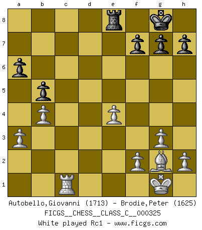 Last move : 1-0 2025 August 15 14:14:3 [Event "FICGS__CHESS__CLASS_C__000325"] [Site "FICGS"] [Date "2024.12.28"] [Round "1"] [White "Autobello,Giovanni"] [Black "Brodie,Peter"] [Result "1-0"] [WhiteElo "1713"] [BlackElo "1625"] 1.c4 c5 2.Nc3 Nc6 3.Nf3 Nf6 4.g3 e5 5.Bg2 Be7 6.O-O O-O 7.d3 d5 8.cxd5 Nxd5 9.a3 Be6 10.Bd2 Qb6 11.Qc2 Rad8 12.Rfc1 Nxc3 13.Bxc3 Qc7 14.Rab1 b6 15.b4 c4 16.dxc4 Bxc4 17.Bxe5 Nxe5 18.Nxe5 Qxe5 19.Qxc4 Qb8 20.Qc7 Qxc7 21.Rxc7 a6 22.Rxe7 Rfe8 23.Rxe8+ Rxe8 24.e4 b5 25.Rc1 Kf8 26.Rc6 Re6 27.Rxe6 fxe6 28.e5 Ke7 29.Bb7 a5 30.bxa5 Kd7 31.a6 Kc7 32.f4 Kb6 33.g4 h6 34.h4 g6 35.h5 gxh5 36.g5 hxg5 37.fxg5 1-0 Follow this game move after move (download)When you absolutely don't know what to do anymore, it is time to panic. (John van der Wiel) Es gibt zwei Arten von Opfern: Korrekte und meine. (Mikhail Nekhemyevich Tal) Con el fin de mejorar tu juego, debes de estudiar los finales antes que todo, ya que mientras que los finales pueden ser estudiados y dominados por sí mismos, el juegomedio y la apertura deben de ser estudiados en relación con los finales. (José Raúl Capablanca) Si le désir cupide (et stupide) de gagner est une inépuisable source de souffrance, une combinaison brillante sur l'échiquier est une découverte : le coquelicot qui s'épanouit lorsque apparaît la Voie Lactée. (Arrabal) It is not true that people stop pursuing dreams because they grow old, they grow old because they stop pursuing dreams. (Gabriel Garcia Marquez)