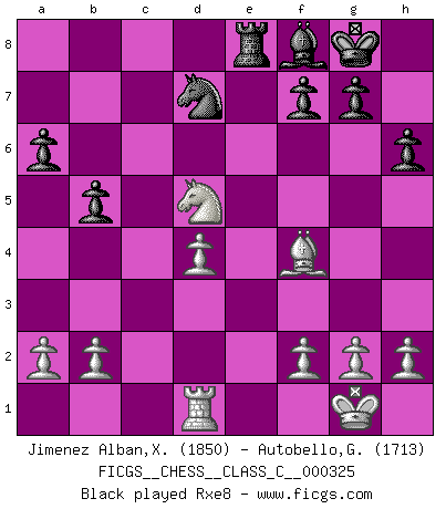 Last move : 1-0 2025 August 23 3:18:45 [Event "FICGS__CHESS__CLASS_C__000325"] [Site "FICGS"] [Date "2024.12.28"] [Round "1"] [White "Jimenez Alban,Xavier Miguel"] [Black "Autobello,Giovanni"] [Result "1-0"] [WhiteElo "1850"] [BlackElo "1713"] 1.d4 Nf6 2.Bf4 e6 3.e3 b6 4.Nf3 Bb7 5.Be2 Be7 6.c4 O-O 7.Nc3 a6 8.Qc2 d5 9.cxd5 exd5 10.O-O Nbd7 11.Rad1 Rc8 12.Ne5 c5 13.Bf3 h6 14.Qf5 cxd4 15.exd4 b5 16.Nxd7 Qxd7 17.Qxd7 Nxd7 18.Bxd5 Bxd5 19.Nxd5 Rfe8 20.Rfe1 Bf8 21.Rxe8 Rxe8 22.g4 Re2 23.Rd2 Re1+ 24.Kg2 Re4 25.Kf3 Re6 26.Rc2 f6 27.Rc8 Nb6 28.Nxb6 Rxb6 29.d5 1-0 This chess game has been lost on time (started : 2024.12.28 16:0:38) Follow this game move after move (download)Chess is the art which expresses the science of logic. (Mikhail Botvinnik) Im Leben werden Partien nie so unstrittig gewonnen wie im Spiel (Emanuel Lasker) Te sientas frente a un tablero y repentinamente tu corazón brinca. Tu mano tiembla al tomar una pieza y moverla. Pero lo que el Ajedrez te enseña es que tu debes permanecer ahí con calma y pensar de que si realmente es una buena idea o de que si hay otras ideas mejores. (Stanley Kubrick) L'action d'une oeuvre littéraire se déroule sur un champ de bataille. Les masques et les types du drame moderne correspondent aux pièces du jeu d'échecs. L'intrigue correspond aux coups et aux gambits, c'est à dire aux techniques du jeu telles qu'utilisées et interprétées par les joueurs. Les tactiques et les péripéties [mouvements] correspondent aux coups exécutés par l'adversaire. (Viktor Shklovsky) An expert is a man who has made all the mistakes which can be made in a very narrow field. (Niels Bohr)