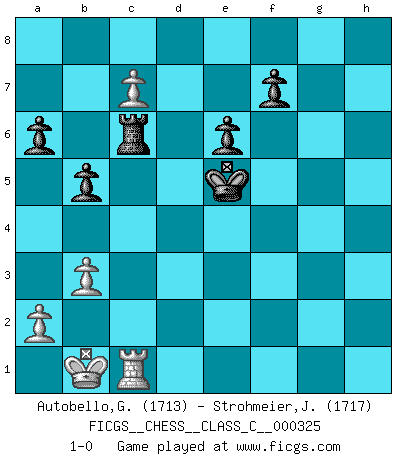 Last move : 1-0 2025 July 13 12:9:36 [Event "FICGS__CHESS__CLASS_C__000325"] [Site "FICGS"] [Date "2024.12.28"] [Round "1"] [White "Autobello,Giovanni"] [Black "Strohmeier,Josef"] [Result "1-0"] [WhiteElo "1713"] [BlackElo "1717"] 1.e4 c5 2.Nf3 Nc6 3.d4 cxd4 4.Nxd4 Nf6 5.Nc3 e6 6.Bg5 Be7 7.f4 d6 8.Bc4 O-O 9.Qd2 h6 10.Bh4 a6 11.O-O-O Qc7 12.Bb3 Na5 13.h3 Bd7 14.g4 Nxb3+ 15.Nxb3 Rac8 16.g5 hxg5 17.Bxg5 g6 18.h4 Kg7 19.Bxf6+ Bxf6 20.e5 Bd8 21.exd6 Qc4 22.Qd4+ Qxd4 23.Nxd4 b5 24.Ne4 Rh8 25.Kb1 Rxh4 26.Rxh4 Bxh4 27.Nf3 Bf6 28.Nxf6 Kxf6 29.Ne5 Rd8 30.b3 g5 31.Nxd7+ Rxd7 32.fxg5+ Kxg5 33.c4 Kf5 34.c5 Ke5 35.c6 Rxd6 36.c7 Rc6 37.Rc1 1-0 Follow this game move after move (download)Everything is in a state of flux, and this includes the world of Chess. (Mikhail Botvinnik) Ich verstehe mehr vom Schach als irgendein anderer lebender Meister. (José Raúl Capablanca) En manos de Fischer's, una diminuta ventaja teórica es tan buena como tener una Reina de ventaja. (Isaac Kashdan) Le jeu d'échecs est comme rejeté hors du temps. (Antoine de Saint-Exupéry) Plans are ideas that never come to fruition. (Daniel Parmet)