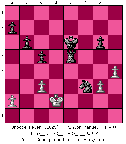 Last move : 0-1 2025 April 27 18:22:41 [Event "FICGS__CHESS__CLASS_C__000325"] [Site "FICGS"] [Date "2024.12.28"] [Round "1"] [White "Brodie,Peter"] [Black "Pintor,Manuel"] [Result "0-1"] [WhiteElo "1625"] [BlackElo "1740"] 1.d4 d5 2.Bf4 Bf5 3.Nf3 f6 4.e3 e6 5.Nc3 Bd6 6.Bd3 Bg4 7.O-O Bxf4 8.exf4 Nc6 9.Bb5 Nge7 10.Re1 O-O 11.Re3 e5 12.Bxc6 Nxc6 13.fxe5 fxe5 14.h3 exd4 15.Rd3 Bxf3 16.Rxf3 dxc3 17.bxc3 Qd6 18.Rg3 Ne5 19.Qd4 c5 20.Qh4 Rf6 21.Rd1 Raf8 22.Rd2 Nc4 23.Qg5 Rg6 24.Qxd5+ Qxd5 25.Rxd5 Rxg3 26.fxg3 b6 27.Rd7 Rf7 28.Rd8+ Rf8 29.Rd7 Ra8 30.Kf2 h5 31.h4 Na3 32.Rd2 Kf7 33.Kf3 Ke6 34.Kf4 Rf8+ 35.Ke4 Rf5 36.Rd8 g6 37.Rd2 Re5+ 38.Kf4 Nc4 39.Rd7 Kxd7 40.g4 Ke6 41.gxh5 Rxh5 42.g3 Na3 43.Ke4 Nxc2 44.Kd3 Ne1+ 45.Ke2 Re5+ 46.Kd2 Nf3+ 0-1 Follow this game move after move (download)I give 98 percent of my mental energy to Chess. Others give only 2 percent. (Bobby Fischer) Schach ist Leben. (Robert James Fischer) Debemos de asegurarnos de que el Ajedrez no se convierta en un lenguaje muerto, muy interesante, pero tan solo para un grupo muy pequeño. (Sytze Faber) Plusieurs personnes se sont demandées comment Tal faisait pour gagner... En fait, c'est très simple ! Il met ses pièces au centre de l'échiquier et les sacrifie quelque part ! (David Bronstein) Computers are like Old Testament gods; lots of rules and no mercy. (Joseph Campbell)