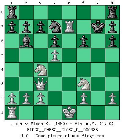 Last move : 1-0 2025 February 10 5:16:56 [Event "FICGS__CHESS__CLASS_C__000325"] [Site "FICGS"] [Date "2024.12.28"] [Round "1"] [White "Jimenez Alban,Xavier Miguel"] [Black "Pintor,Manuel"] [Result "1-0"] [WhiteElo "1850"] [BlackElo "1740"] 1.e4 e5 2.Nf3 Bc5 3.Nxe5 Qh4 4.d4 Qxe4+ 5.Be3 Bb6 6.Nd2 Qh4 7.Bc4 Nh6 8.Ndf3 Qh5 9.g4 Qh3 10.Bf1 Qxf1+ 11.Rxf1 d6 12.Bxh6 gxh6 13.Nc4 Bxg4 14.Rg1 Be6 15.d5 Bg4 16.Rxg4 Nd7 17.Re4+ Kf8 18.Qd2 Kg7 19.Qc3+ f6 20.Re7+ 1-0 Follow this game move after move (download)I'm not afraid of Spassky. The world knows I'm the best. You don't need a match to prove it. (Bobby Fischer) Zeige mir drei Eröffnungsvarianten und ich beweise dir, dass zwei davon inkorrekt sind. (Emanuel Lasker) El Ajedrez es despiadado: debes de estar preparado para matar gente. (Nigel Short) Assurément je connaissais par expérience le mystérieux attrait de ce jeu royal, le seul entre tous les jeux inventés par les hommes qui échappe souverainement à la tyrannie du hasard, le seul où l'on ne doive sa victoire qu'à son intelligence ou plutôt à une certaine forme d'intelligence. Mais n'est-ce pas déjà le limiter injurieusement que d'appeler les échecs un jeu ? N'est-ce pas une science, un art ou quelque chose qui, comme le cercueil de Mahomet entre ciel et terre, est suspendu entre l'un et l'autre, et qui réunit un nombre incroyable de contraires ? [...] C'est une pensée qui ne mène à rien, une mathématique qui n'établit rien, un art qui ne laisse pas d'uvre, une architecture sans matière; et il l'a prouvé néanmoins qu'il était plus durable, à sa manière, que les livres ou que tout autre monument, ce jeu unique qui appartient à tous les peuples et à tous les temps, et dont personne ne sait quel dieu en fit don à la terre pour tuer l'ennui, pour aiguiser l'esprit et stimuler l'âme. Où commence-t-il, où finit-il ? (Stefan Zweig) Looking at the proliferation of personal web pages on the Net, it looks like very soon everyone on Earth will have 15 megabytes of fame. (M.G. Sriram)