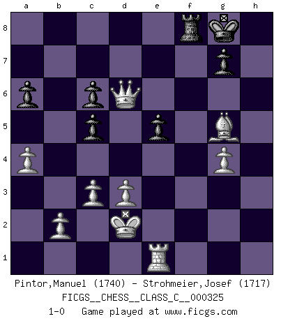 Last move : 1-0 2025 February 15 23:12:31 [Event "FICGS__CHESS__CLASS_C__000325"] [Site "FICGS"] [Date "2024.12.28"] [Round "1"] [White "Pintor,Manuel"] [Black "Strohmeier,Josef"] [Result "1-0"] [WhiteElo "1740"] [BlackElo "1717"] 1.e4 c5 2.f4 Nc6 3.Nf3 d6 4.Bc4 e6 5.O-O a6 6.a4 Qc7 7.d3 Be7 8.Ng5 h6 9.Qh5 Bxg5 10.fxg5 Ne5 11.Nc3 Bd7 12.Bf4 Ng6 13.gxh6 Nxh6 14.Bg5 Ng8 15.Qf3 Bc6 16.Rf2 d5 17.exd5 Qxh2+ 18.Kf1 Qc7 19.dxc6 bxc6 20.Bxe6 fxe6 21.Ke2 Nh6 22.Ne4 Nf5 23.c3 Rb8 24.Rb1 O-O 25.Qh5 Ng3+ 26.Nxg3 Qe5+ 27.Ne4 Rxf2+ 28.Kxf2 Rf8+ 29.Ke3 Ne7 30.Re1 Nf5+ 31.Kd2 Qd5 32.g4 Nd6 33.Nxd6 Qxd6 34.Qg6 e5 35.Qxd6 1-0 Follow this game move after move (download)The beauty of a move lies not in its' appearance but in the thought behind it. (Siegbert Tarrasch) Es ist peinlich, dass ich nie Weltmeister wurde. Es wäre leicht, Leonid Breschnjew als Ursache vorzuschieben, dessen Apparat den Vorzeigekommunisten Anatoli Karpow in allem unterstützte. Aber Garri Kasparow zum Beispiel, der ebenfalls von den Sowjets unerwünscht war, hat trotz der Widerstände den WM-Titel erobert. (Viktor Kortschnoi) Si no le temes a Spassky, entonces elimino el elemento del dinero. (Jim Slater) Le profane ne songe pas à la somme de jouissance dont il se prive, qui méconnaît ce jeu aux ressources aussi variées que passionnantes. (Jean-Marie Jeanton-Lamarche) I'll be back. (Arnold Schwarzenegger)