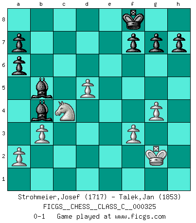 Last move : 0-1 2025 March 12 21:56:59 [Event "FICGS__CHESS__CLASS_C__000325"] [Site "FICGS"] [Date "2024.12.28"] [Round "1"] [White "Strohmeier,Josef"] [Black "Talek,Jan"] [Result "0-1"] [WhiteElo "1717"] [BlackElo "1853"] 1.e4 c6 2.d4 d5 3.Nc3 dxe4 4.Nxe4 Nf6 5.Nxf6+ exf6 6.Nf3 Bd6 7.Be2 O-O 8.O-O Re8 9.h3 Na6 10.Bxa6 bxa6 11.Be3 Bc7 12.Qd2 Qd6 13.Rfe1 Be6 14.Rad1 Bd5 15.Qe2 f5 16.g3 f4 17.Bxf4 Rxe2 18.Bxd6 Rxe1+ 19.Nxe1 Bxd6 20.b3 Be6 21.c4 Bxh3 22.Kh2 Be6 23.d5 cxd5 24.cxd5 Bg4 25.f3 Bf5 26.Kg2 Rc8 27.g4 Bd7 28.Rd2 Bb4 29.Re2 Re8 30.Rxe8+ Bxe8 31.Nd3 Bd6 32.Kf2 Bb5 33.Nb2 Bc5+ 34.Kg2 Bb4 35.Nc4 Kf8 0-1 Follow this game move after move (download)There's never before been a Chess player with such a thorough knowledge of the intricacies of the game and such an absolutely indomitable will to win. I think Bobby is the greatest player that ever lived. (Lisa Lane) Herr Iljumschinow ist ein etwas merkwürdiger Geschäftsmann: Er arbeitet zusammen mit Leuten wie Muammar al-Gaddafi; früher ist das Saddam Hussein gewesen. (Joel Lautier) Vive, pierde y aprende al observar a tu oponente como gana. (Amber Steenbock) L'ordinateur a tué l'originalité. Il n'y a plus guère d'aventures sur l'échiquier. (Jacob Murray) When you stop learning you start dying. (Scott Adams)