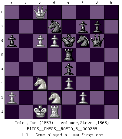 Last move : 1-0 2025 April 12 11:44:3 [Event "FICGS__CHESS__RAPID_B__000399"] [Site "FICGS"] [Date "2024.12.28"] [Round "1"] [White "Talek,Jan"] [Black "Vollmer,Steve"] [Result "1-0"] [WhiteElo "1853"] [BlackElo "1863"] 1.c3 e5 2.d4 e4 3.c4 Bb4+ 4.Bd2 Bxd2+ 5.Nxd2 Nf6 6.e3 O-O 7.Ne2 Re8 8.Nc3 d6 9.Be2 Bf5 10.g4 Bg6 11.h4 h6 12.g5 hxg5 13.hxg5 Nh7 14.Bh5 Qxg5 15.Bxg6 Qxg6 16.Qb3 Nd7 17.Qxb7 Nhf6 18.Qxc7 Rab8 19.Qxd6 Rxb2 20.Qh2 Kf8 21.Qd6+ Kg8 22.O-O-O Rb6 23.Qh2 Kf8 24.Qc7 a6 25.Rh8+ Ke7 26.Rxe8+ Kxe8 27.c5 Re6 28.d5 Re5 29.Qc8+ Ke7 30.d6+ Ke6 31.c6 1-0 Follow this game move after move (download)Chess is war over the board. The object is to crush the opponents mind. (Bobby Fischer) Spielt Blackmar-Diemer-Gambit, und das Matt kommt von selbst! (Emil Joseph Diemer) Yo considero que Fischer es uno de los expertos mas grandes de aperturas de siempre. (Keith Hayward) Toute estimation doit être constamment réévaluée. (Jacob Estrin) If things go wrong, don't go with them. (Roger Babson)