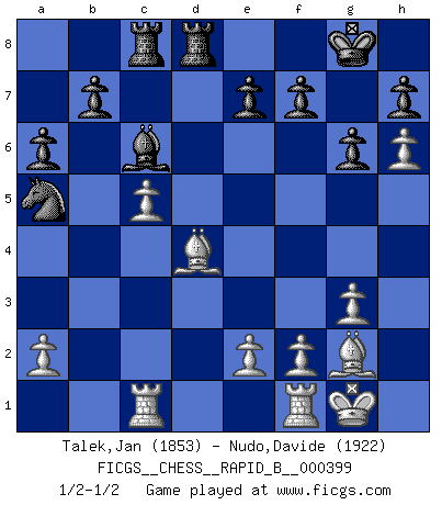 Last move : 1/2-1/2 2025 February 12 22:47:9 [Event "FICGS__CHESS__RAPID_B__000399"] [Site "FICGS"] [Date "2024.12.28"] [Round "1"] [White "Talek,Jan"] [Black "Nudo,Davide"] [Result "1/2-1/2"] [WhiteElo "1853"] [BlackElo "1922"] 1.c4 c5 2.Nf3 Nf6 3.g3 g6 4.Bg2 Bg7 5.d4 d5 6.cxd5 O-O 7.O-O cxd4 8.Nxd4 Nxd5 9.Nc3 Nxc3 10.bxc3 Nc6 11.Be3 Na5 12.Qd3 a6 13.c4 Qc7 14.Rac1 Rd8 15.Qe4 Bf6 16.c5 Bd7 17.h4 Rac8 18.h5 Qe5 19.Qxe5 Bxe5 20.h6 Bxd4 21.Bxd4 Bc6 1/2-1/2 Follow this game move after move (download)You may learn much more from a game you lose than from a game you win. You will have to lose hundreds of games before becoming a good player. (Jose Raul Capablanca) Wenn du gegen Bobby spielst, ist es keine Frage von gewinnen oder verlieren. Es ist eine Frage des Überlebens. (Boris Vassilievich Spassky) Morphy probablemente fue el genio más grande de todos. (Bobby Fischer) Votre prénom est 'Tactique', votre deuxième prénom est 'Tactique' et votre nom est 'Tactique'. (Ken Smith) To send light into the darkness of men's hearts - such is the duty of the artist. (Schumann)