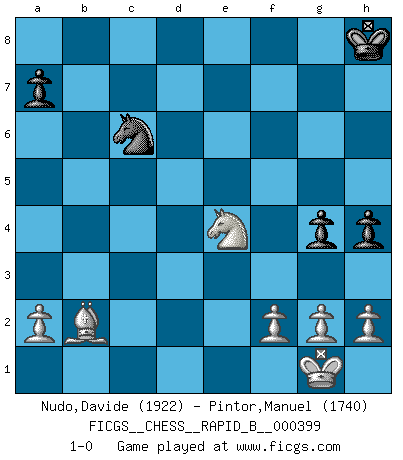 Last move : 1-0 2025 February 4 11:35:14 [Event "FICGS__CHESS__RAPID_B__000399"] [Site "FICGS"] [Date "2024.12.28"] [Round "1"] [White "Nudo,Davide"] [Black "Pintor,Manuel"] [Result "1-0"] [WhiteElo "1922"] [BlackElo "1740"] 1.e4 e5 2.d4 exd4 3.c3 dxc3 4.Bc4 cxb2 5.Bxb2 Qg5 6.Nf3 Qc5 7.Qe2 Nf6 8.O-O d6 9.e5 dxe5 10.Nxe5 Be6 11.Re1 Be7 12.Ba3 Qd4 13.Nxf7 Qxc4 14.Qxc4 Bxc4 15.Rxe7+ Kf8 16.Nxh8 Kg8 17.Rxc7 Nc6 18.Rxb7 Kxh8 19.Rc7 Bd5 20.Nc3 Ne8 21.Nxd5 Nxc7 22.Nxc7 Rc8 23.Re1 h5 24.Re8+ Rxe8 25.Nxe8 g5 26.Nf6 h4 27.Ne4 g4 28.Bb2+ 1-0 Follow this game move after move (download)Chess holds its master in its own bonds, shackling the mind and brain so that the inner freedom of the very strongest must suffer. (Albert Einstein) Die unerbitterlichsten Regeln im Schach sind die Ausnahmen. (Savielly Grigorievitsch Tartakower) El Ajedrez es el juego mas altamente simbólico, pero las agresiones estan por lo tanto aún mas francamente representadas en la partida. Tal vez comenzo como un juego de guerra; Algo como la representación de una batalla en miniatura entre las fuerzas de dos reinos. (Karl Meninger) Le joueur d'Echecs qui veut atteindre le top est obligé de développer son propre credo créatif. Alexeï Stepanovicth Souétine. Il est facile d'écrire des livres ! Ce qui est difficile, c'est de jouer ! (Alexeï Stepanovicth Souétine) All men can see these tactics whereby I conquer, but what none can see is the strategy out of which victory is evolved. (Sun Tzu)