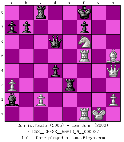 Last move : 1-0 2007 October 4 1:59:29 [Event "FICGS__CHESS__RAPID_A__000027"] [Site "FICGS"] [Date "2007.09.25"] [Round "1"] [White "Schmid,Pablo"] [Black "Law,John"] [Result "1-0"] [WhiteElo "2006"] [BlackElo "2000"] 1.d4 Nf6 2.f3 d5 3.e4 dxe4 4.Nc3 e6 5.fxe4 Bb4 6.a3 Bxc3+ 7.bxc3 Nxe4 8.Qg4 Nxc3 9.Bd3 g6 10.Nf3 e5 11.Qg3 exd4 12.O-O Nc6 13.Bg5 Qd6 14.Bf4 Qd5 15.Rae1+ Be6 16.Bxc7 O-O 17.Ng5 Rfe8 18.Be5 Nxe5 19.Rxe5 Qc6 20.Qh4 h5 21.Nh7 Ba2 22.Nf6+ Kf8 23.Rc5 Qd6 24.Bxg6 Ne2+ 25.Kh1 Nf4 26.Bxh5 Re3 27.Rf5 Nxg2 28.Kxg2 Rc8 29.Kg1 1-0 Blackmar-Diemer gambit Kingside Castling by player White (move 12) Kingside Castling by player Black (move 16) Player White won this chess game. Follow this game move after move (download)You must take your opponent into a deep dark forest where 2+2=5, and the path leading out is only wide enough for one. (Mikhail Tal) Du musst Deinen Gegner in einen tiefen dunklen Wald führen wo 2+2=5 ist und wo der Weg, der wieder hinausführt, nur breit genug für einen ist. (Mikhail Nekhemyevich Tal) Tu puedes aprender mucho mas de una partida que pierdas que de una partida ganada. Tendras que perder cientos de partidas antes de llegar a ser un buen jugador. (Jose Raul Capablanca) La vie et les Echecs sont tous les deux une lutte constante. (Lasker) The Internet isn't free. It just has an economy that makes no sense to capitalism. (Brad Shapcott)