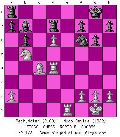 Last move : 1/2-1/2 2025 April 3 5:26:34 [Event "FICGS__CHESS__RAPID_B__000399"] [Site "FICGS"] [Date "2024.12.28"] [Round "1"] [White "Pech,Matej"] [Black "Nudo,Davide"] [Result "1/2-1/2"] [WhiteElo "2100"] [BlackElo "1922"] 1.c4 c5 2.Nf3 Nf6 3.Nc3 d5 4.cxd5 Nxd5 5.d4 Nxc3 6.bxc3 e6 7.e4 cxd4 8.cxd4 Bb4+ 9.Bd2 Bxd2+ 10.Qxd2 O-O 11.Bc4 Nd7 12.O-O b6 13.Rfe1 Bb7 14.Rad1 Nf6 15.d5 exd5 16.exd5 Qd6 17.Nd4 g6 18.Nb5 Qc5 19.Qd4 Qxd4 20.Rxd4 Rfd8 21.d6 Rd7 1/2-1/2 Follow this game move after move (download)Best by test: 1. e4 (Bobby Fischer) Du musst nicht gut spielen, es reicht, wenn du besser spielst als dein Gegner. (Anonymous) Todos los Maestros de Ajedrez fueron un día unos principiantes. (Chernev) RxDa4 pat (...) A married woman is like a fish riding a bicycle. (Rodolfo d'Ettorre)