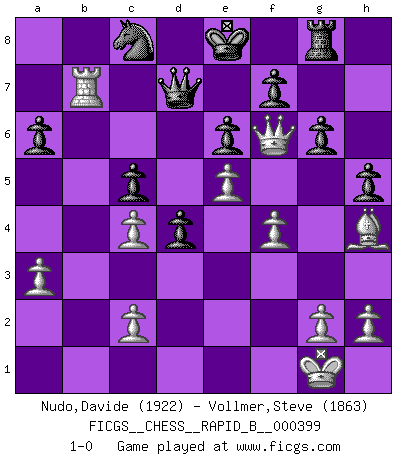 Last move : 1-0 2025 February 5 10:25:32 [Event "FICGS__CHESS__RAPID_B__000399"] [Site "FICGS"] [Date "2024.12.28"] [Round "1"] [White "Nudo,Davide"] [Black "Vollmer,Steve"] [Result "1-0"] [WhiteElo "1922"] [BlackElo "1863"] 1.e4 e6 2.d4 d5 3.Nc3 Nf6 4.e5 Nfd7 5.f4 c5 6.Nf3 Nc6 7.Be3 cxd4 8.Nxd4 Bb4 9.a3 Bxc3+ 10.bxc3 a6 11.Bd3 Qc7 12.Qg4 g6 13.Nxc6 bxc6 14.O-O c5 15.Qh4 h5 16.Qh3 Nb6 17.Rab1 Bd7 18.Qh4 Nc8 19.c4 d4 20.Qf6 Rg8 21.Be4 Rb8 22.Bf2 Rxb1 23.Rxb1 Bc6 24.Bxc6+ Qxc6 25.Bh4 Qd7 26.Rb7 1-0 Follow this game move after move (download)The blunders are all there on the board, waiting to be made. (Savielly Tartakover) Schach ist die gewalttätigste aller Sportarten. (Garry Kasparov) Dejen al perfeccionista jugar por correo. (Yasser Seirawan) Seul un grand joueur sait à quel point il joue faiblement. (Xavier Tartacover) It is not titles that honor men, but men that honor titles. (Niccolo Machiavelli)